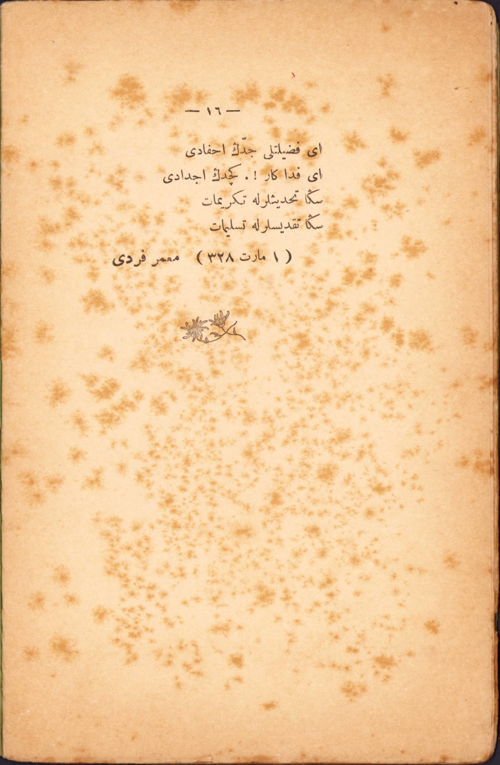 Şebab-ı Nuran-i: Eski Türklüğün Yeni Gençliğine, Muammer Ferdi, Ahmet İhsan ve Şürekası, İstanbul, hicri 1328, Osmanlıca, 16 sayfa, 14x20 cm