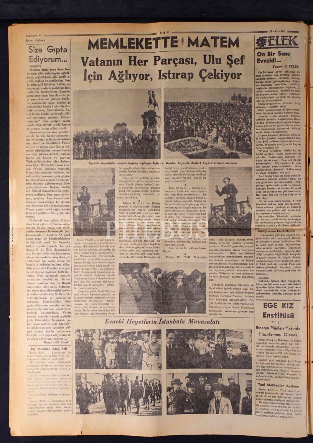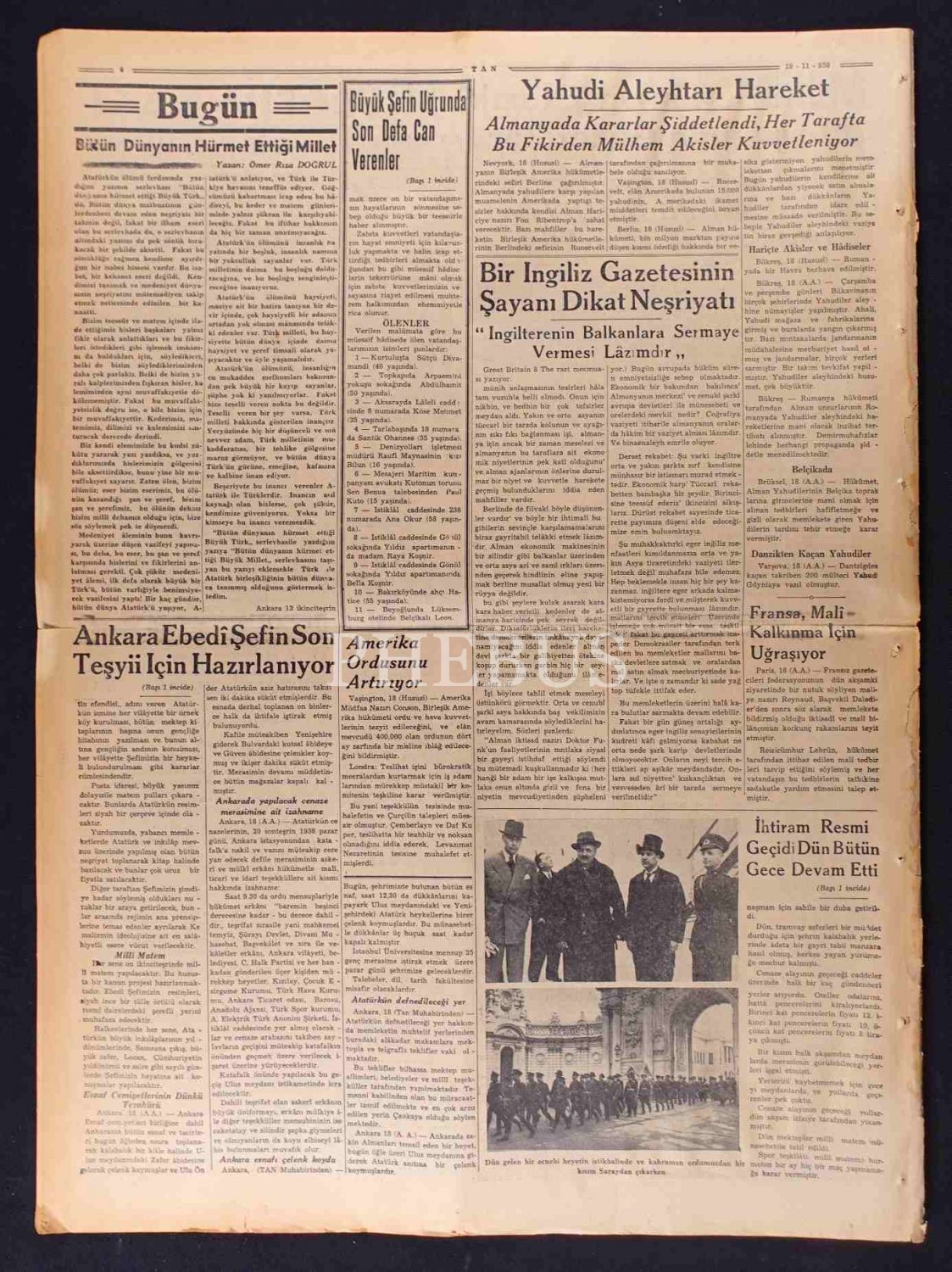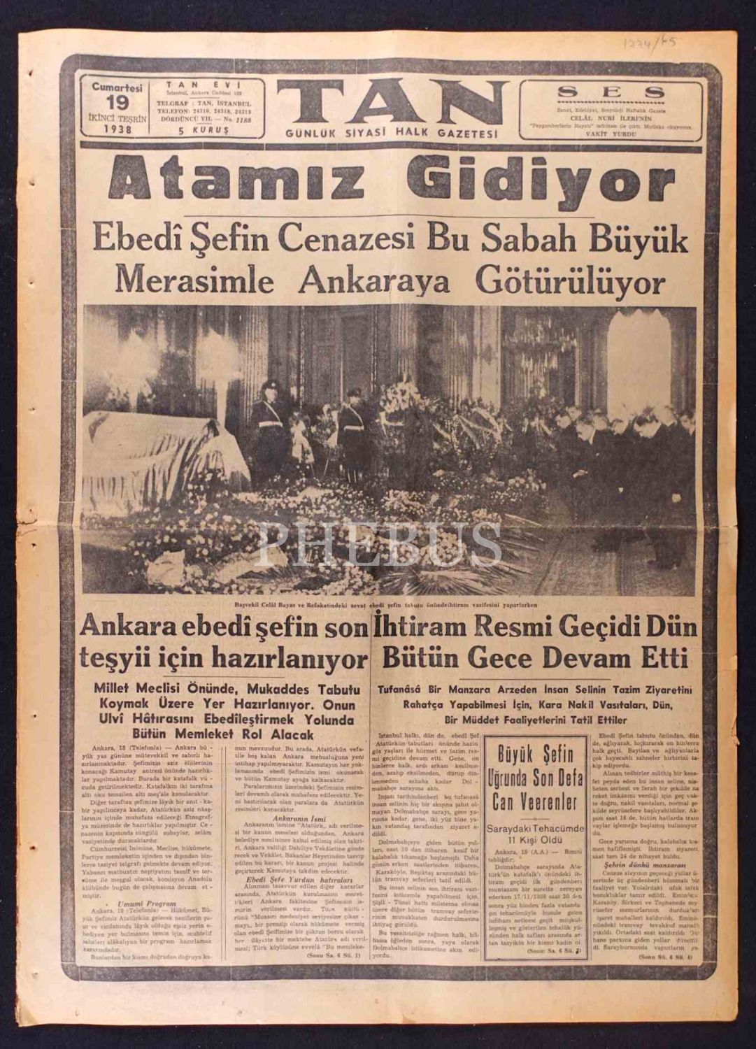 "Atamız Gidiyor": Tan gazetesinin Atatürk´ün cenaze törenine dair haberleriyle 19 İkinciteşrin 1938 tarihli sayısı, 42x58 cm