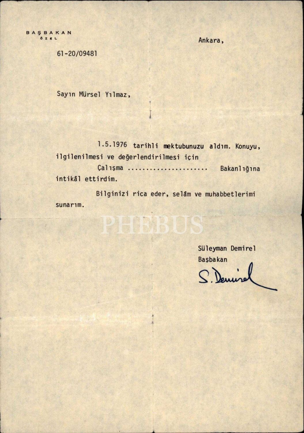 Başbakan Özel antetli kâğıtta Süleyman Demirel ıslak imzalı mektup, 17x25 cm