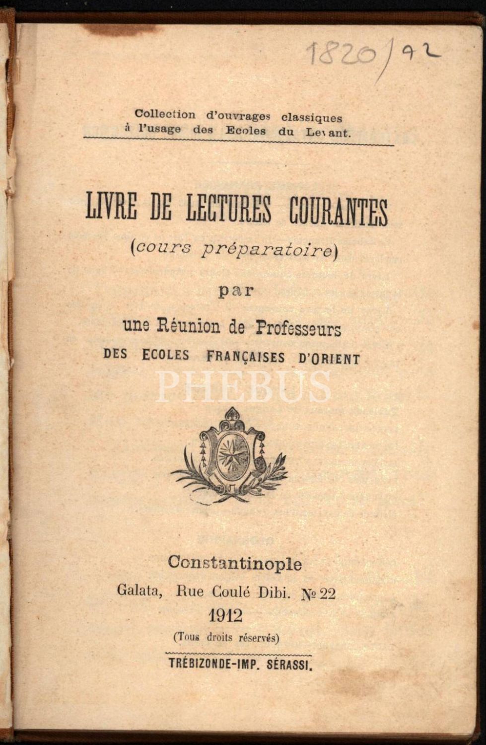 Fransızca LIVRE DE LECTURES COURANTES, Constantinople 1912, 99 s., 13x19 cm