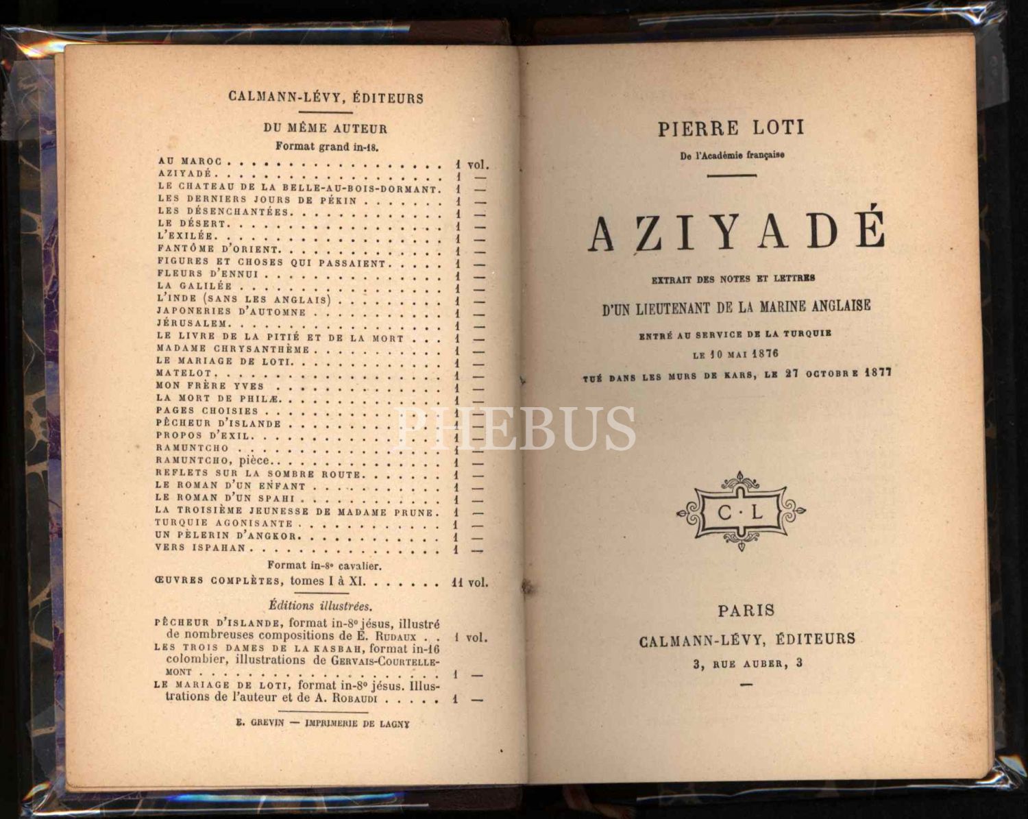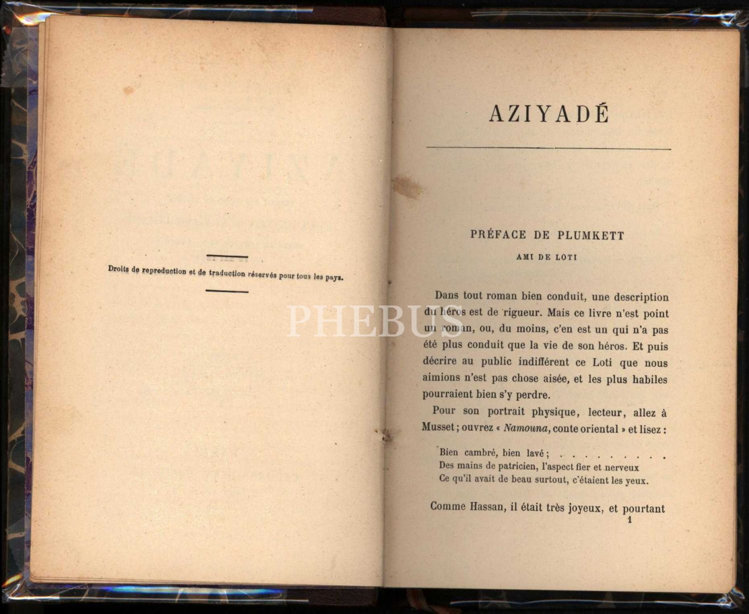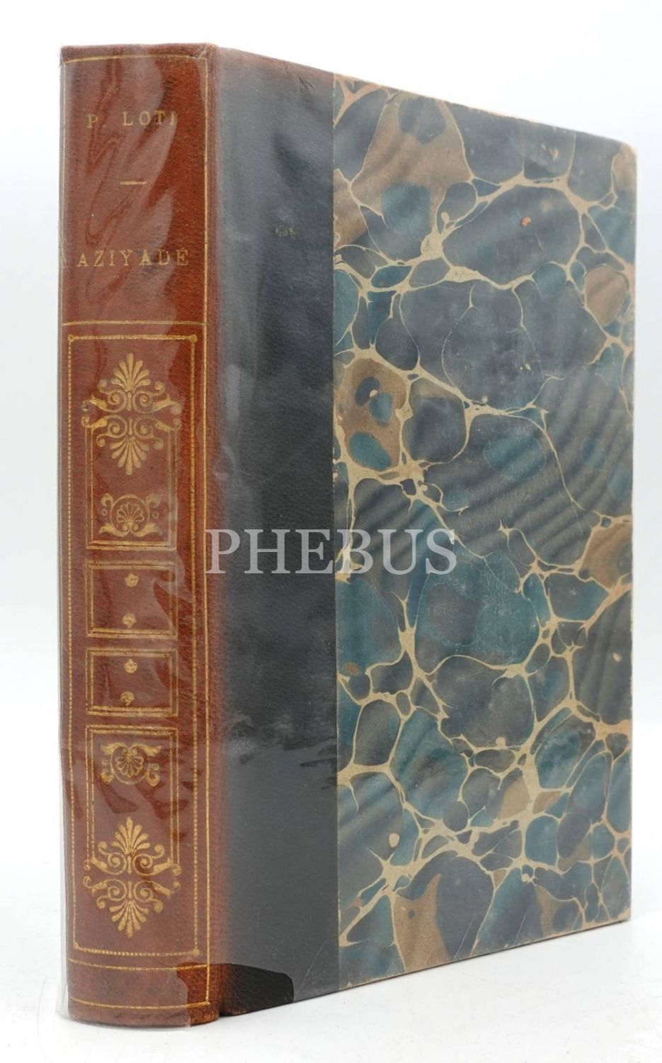 Sırtı deri ve kapakları ebrulu orijinal cildinde Fransızca AZIYADE, Pierre Loti, Paris, 317 s., 12x19 cm