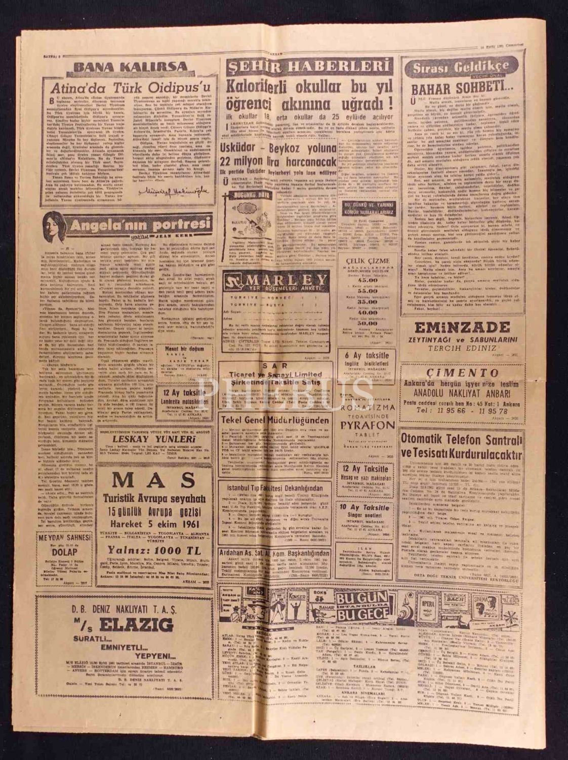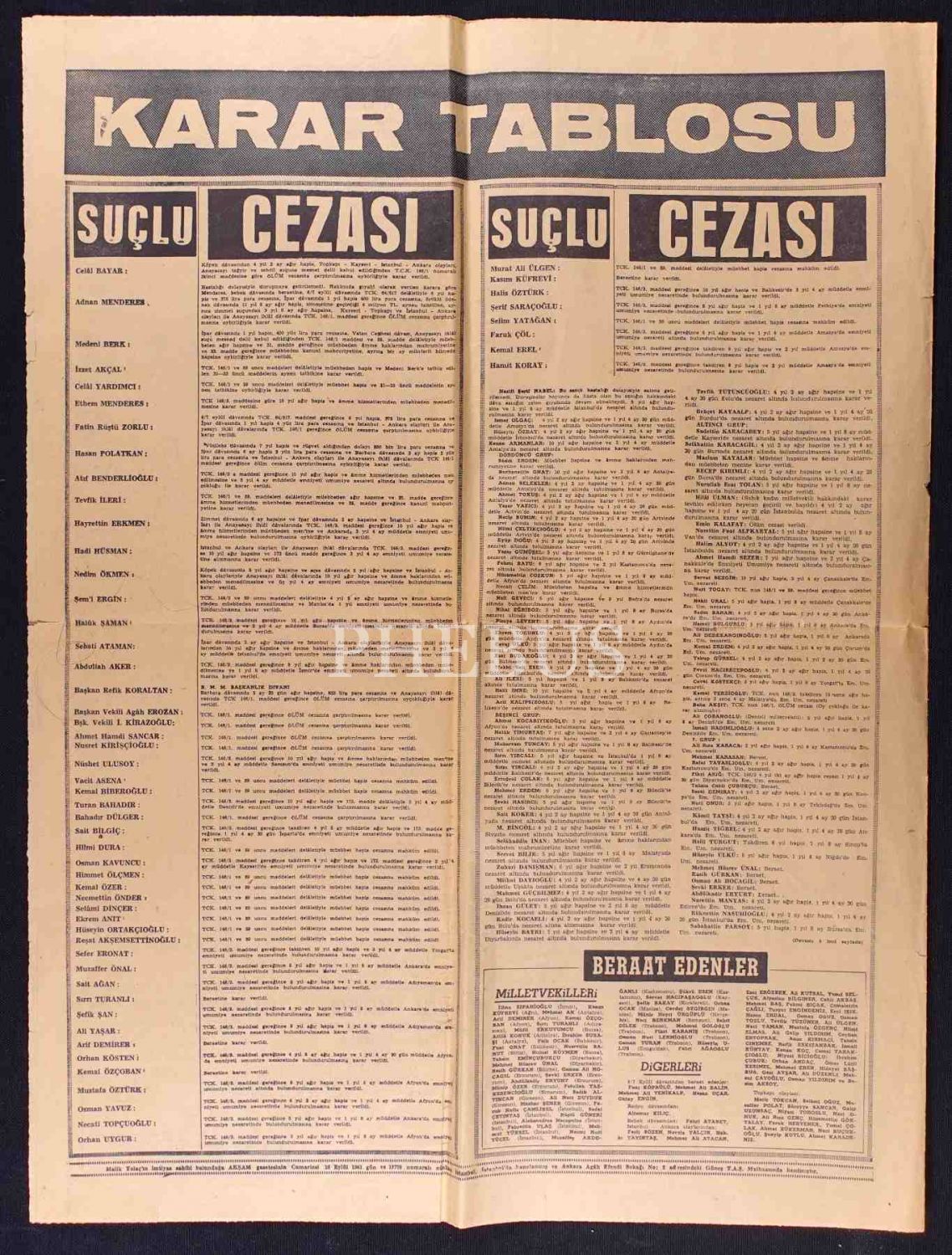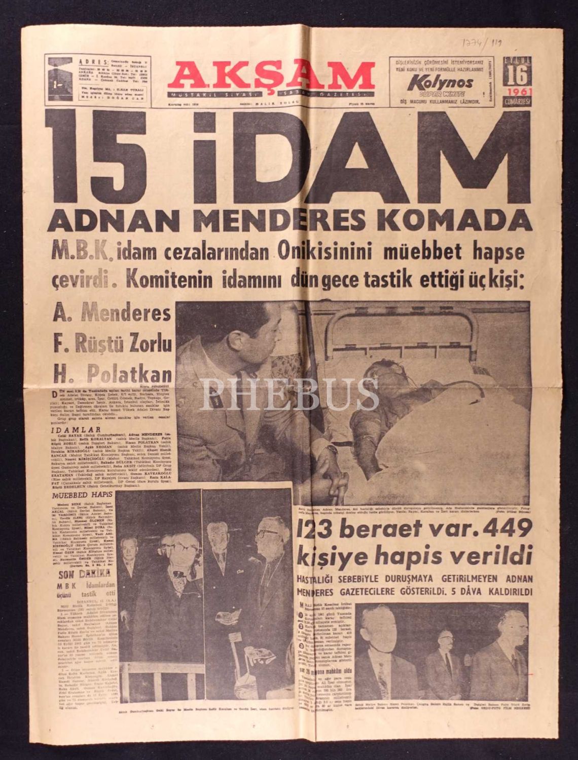 Akşam gazetesinin "15 İdam- Adnan Menderes Komada" manşetli sayısı, 16 Eylül 1961, 43x57 cm