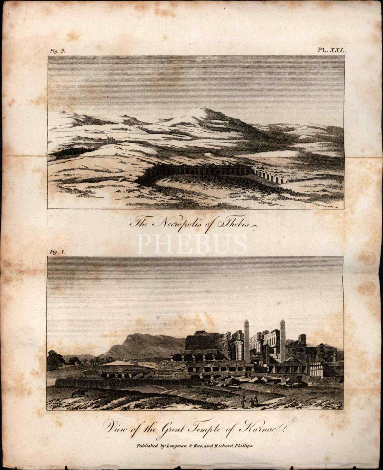 Tek sayfada Mısır Karnak Tapınağı ve Teb gravürü, Longman&Rees-Richard Phillips yayımı, 21x26 cm