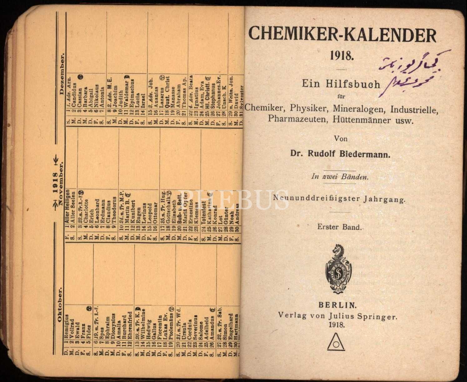 "Kimyager Yüzbaşı ?"ya ait Almanca CHEMIKER-KALENDER, Dr. Rudolf Biedermann, Berlin 1918, 454 s., 10x15 cm