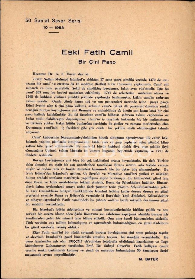 ESKİ FATİH CAMİİ BİR ÇİNİ PANO, 50 San´at Sever Serisi, Muzaffer Batur, 2 sayfa, 18x23 cm