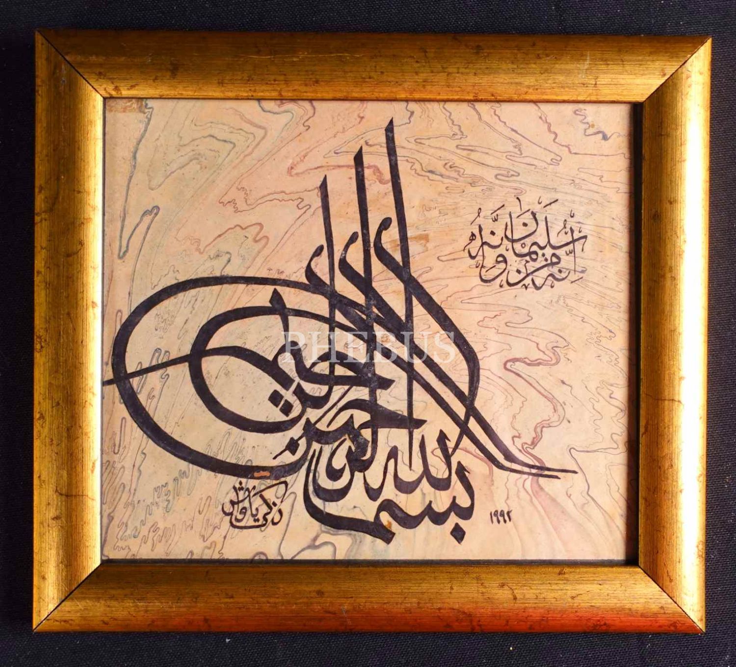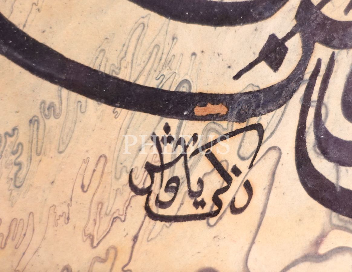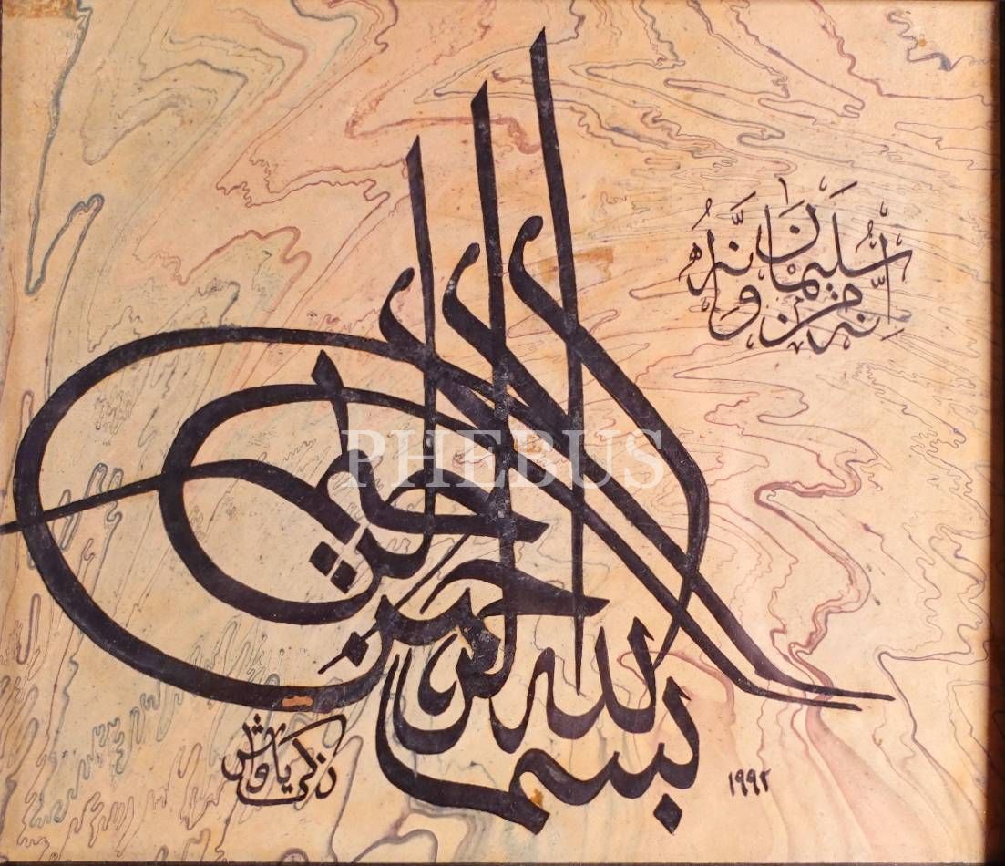 Zeki Yavaş ketebeli, 1992 tarihli ebru üzerine tuğra formunda besmele, 20x22 cm