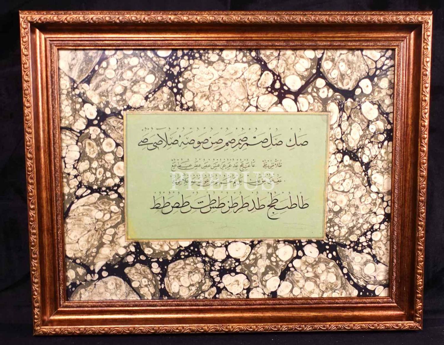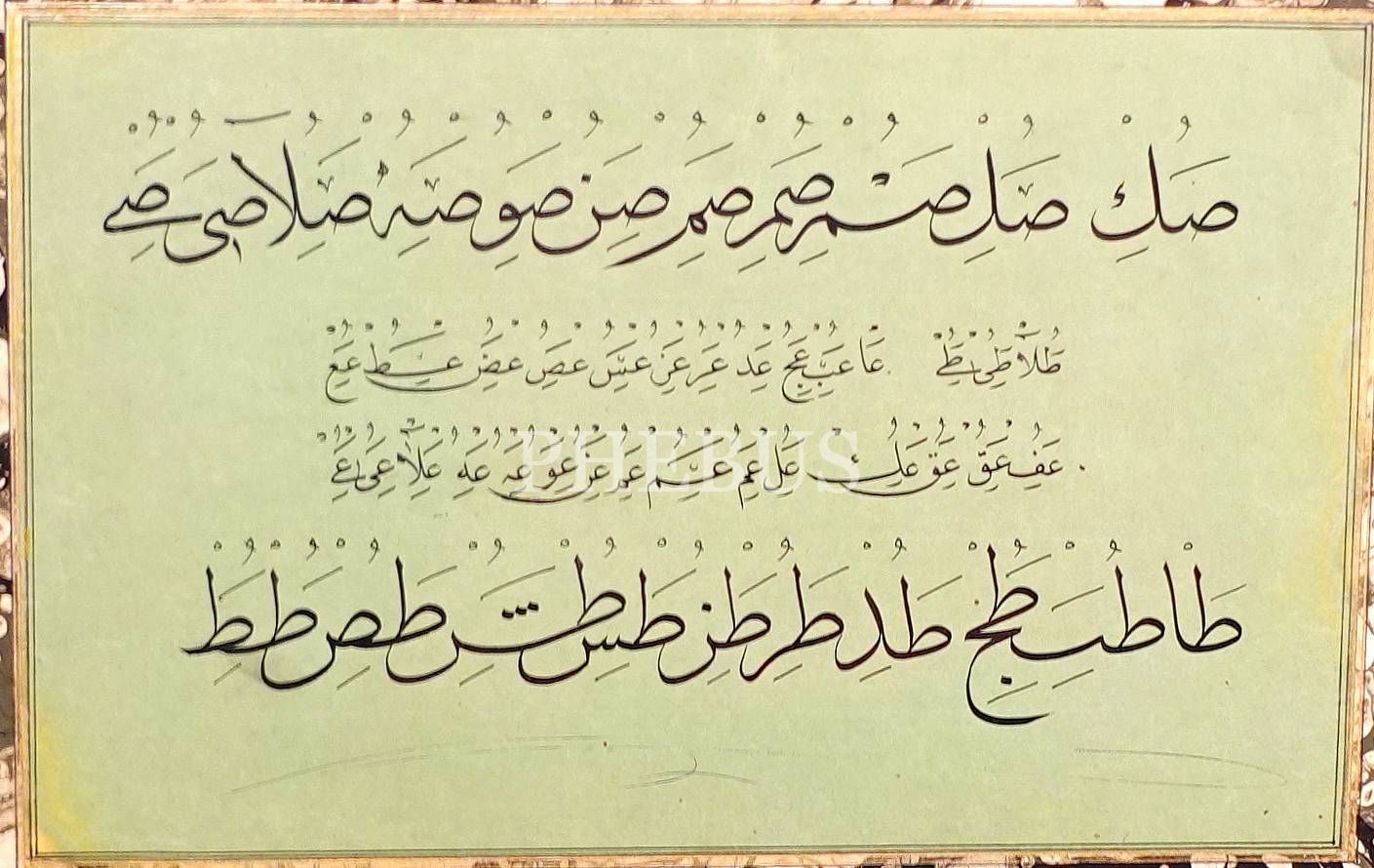 Hoca işi sülüs-nesih hurufat meşki, ebru pervazlı, yazı: 16x25 cm, çerçeve: 40x49 cm
