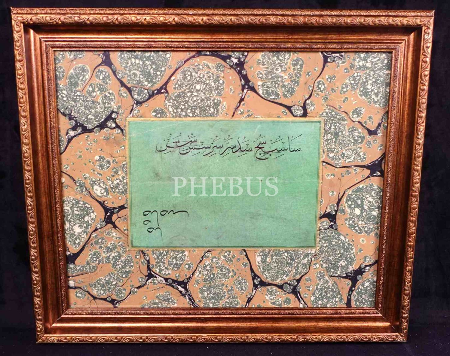 Sülüs "sin" ve "sad" meşki, ebru pervazlı, yazı:15x25 cm, çerçeve: 39x40 cm