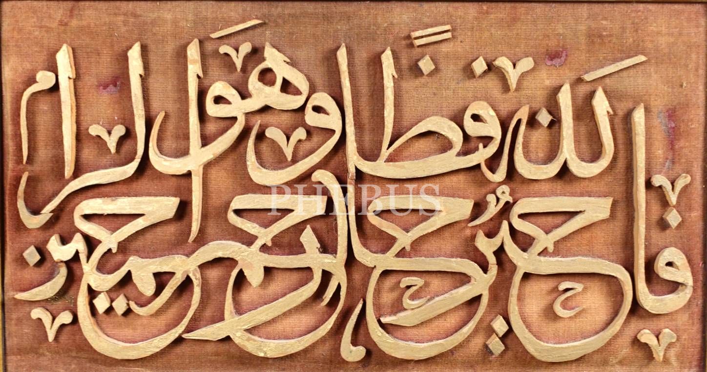 Ahşap oyma tekniği ile yazılmış Yusuf Suresi 64. ayet, 26x44 cm