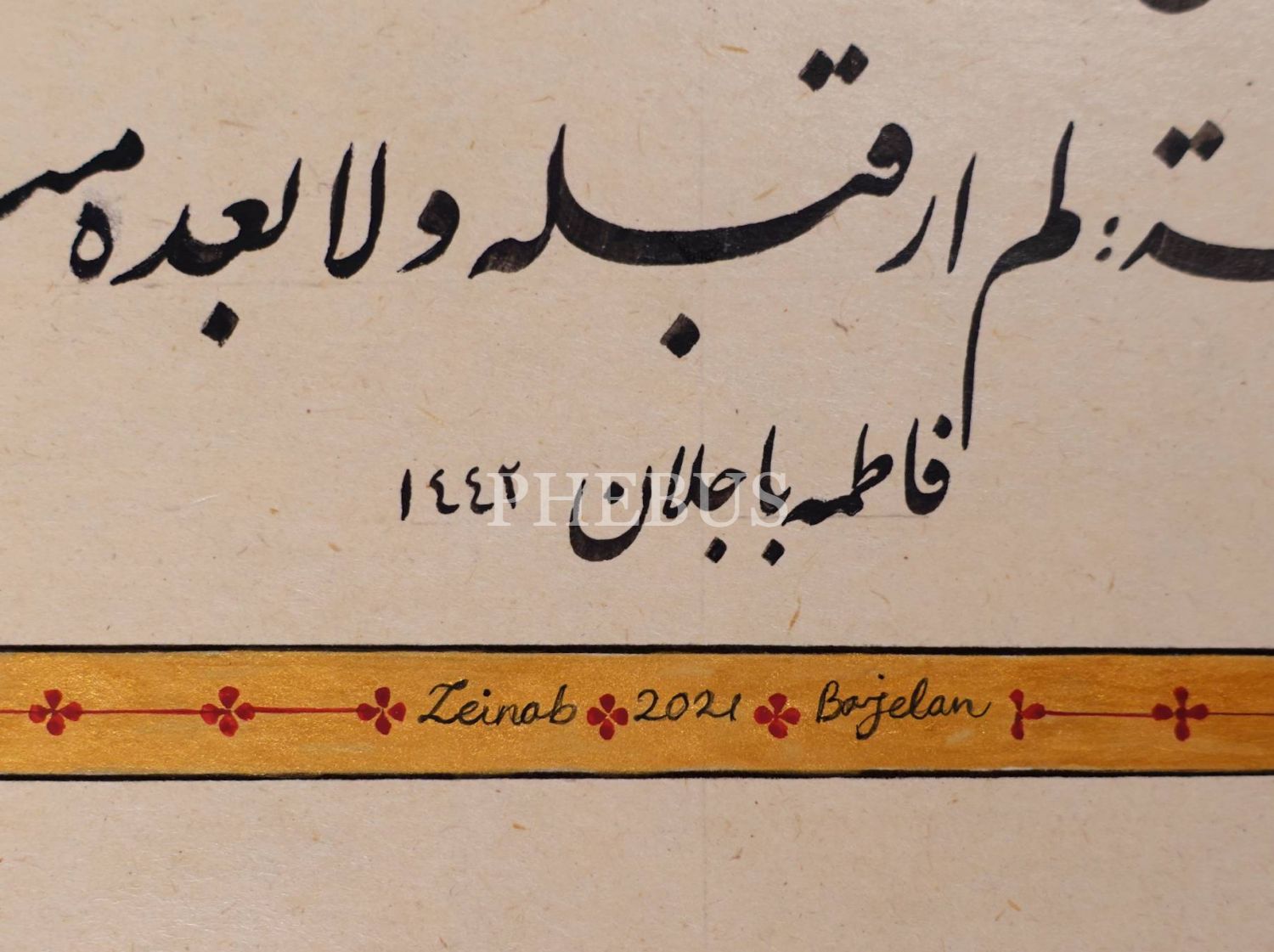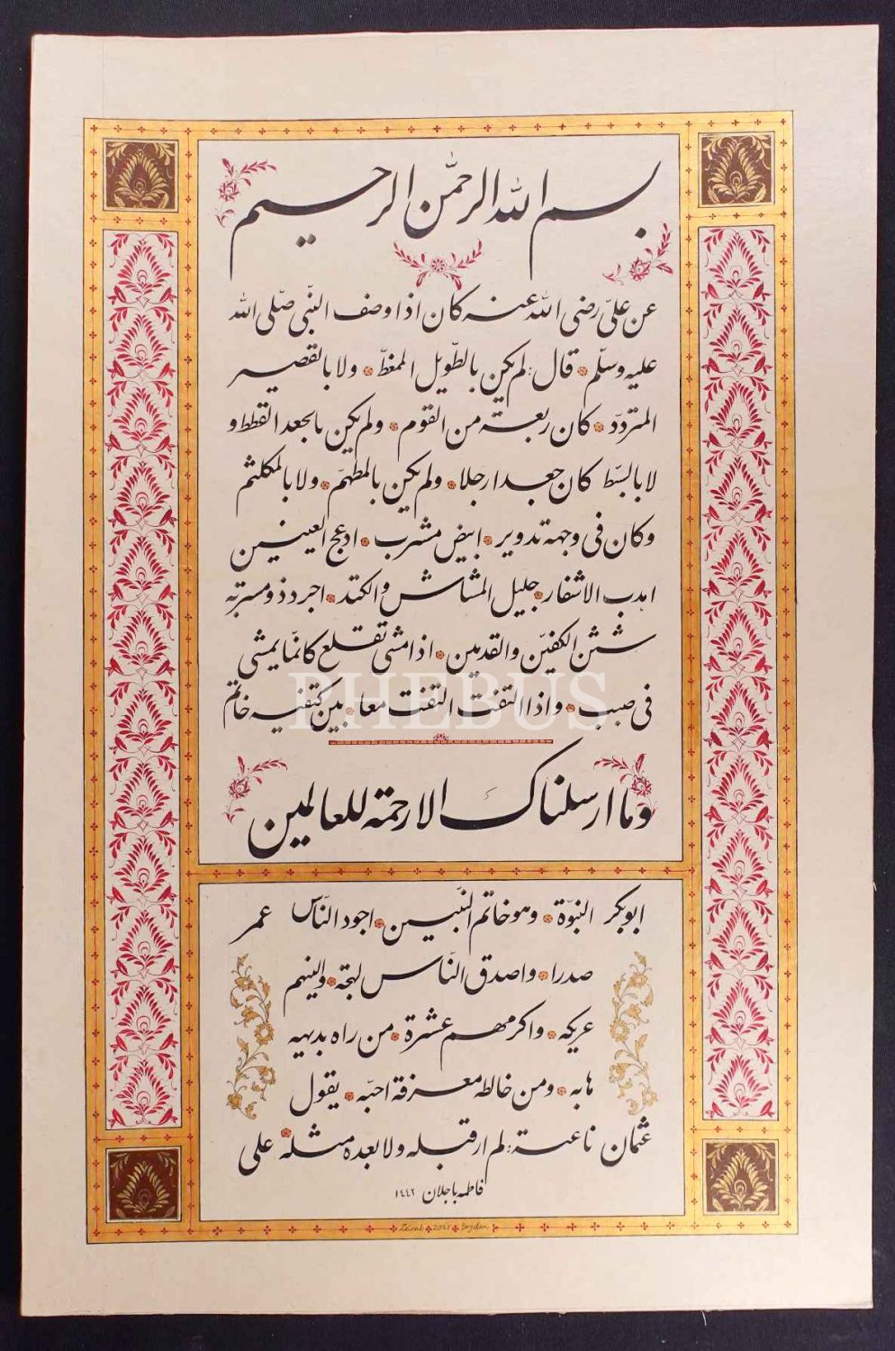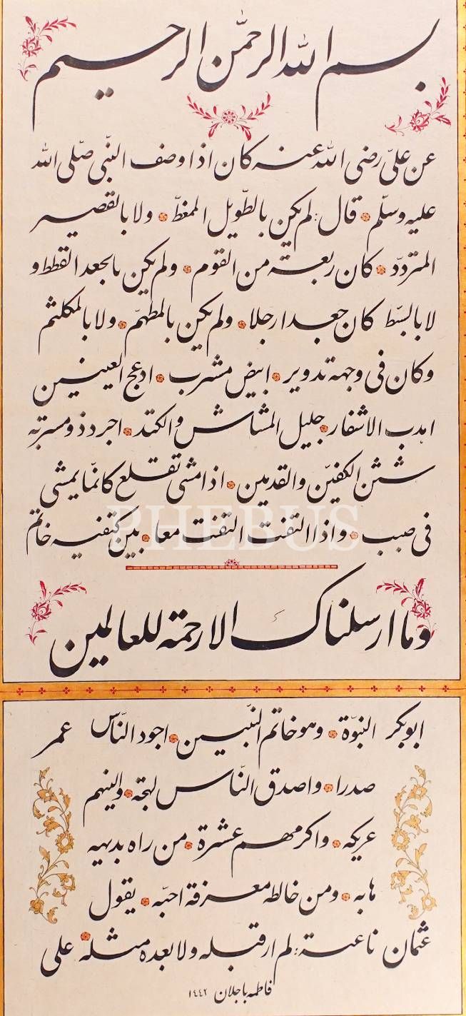 Fatma Bacelan ketebeli ta´lik hilye-i şerif, tezhibi Zeinab Bajelan imzalı, 1442 tarihli, 38x60 cm