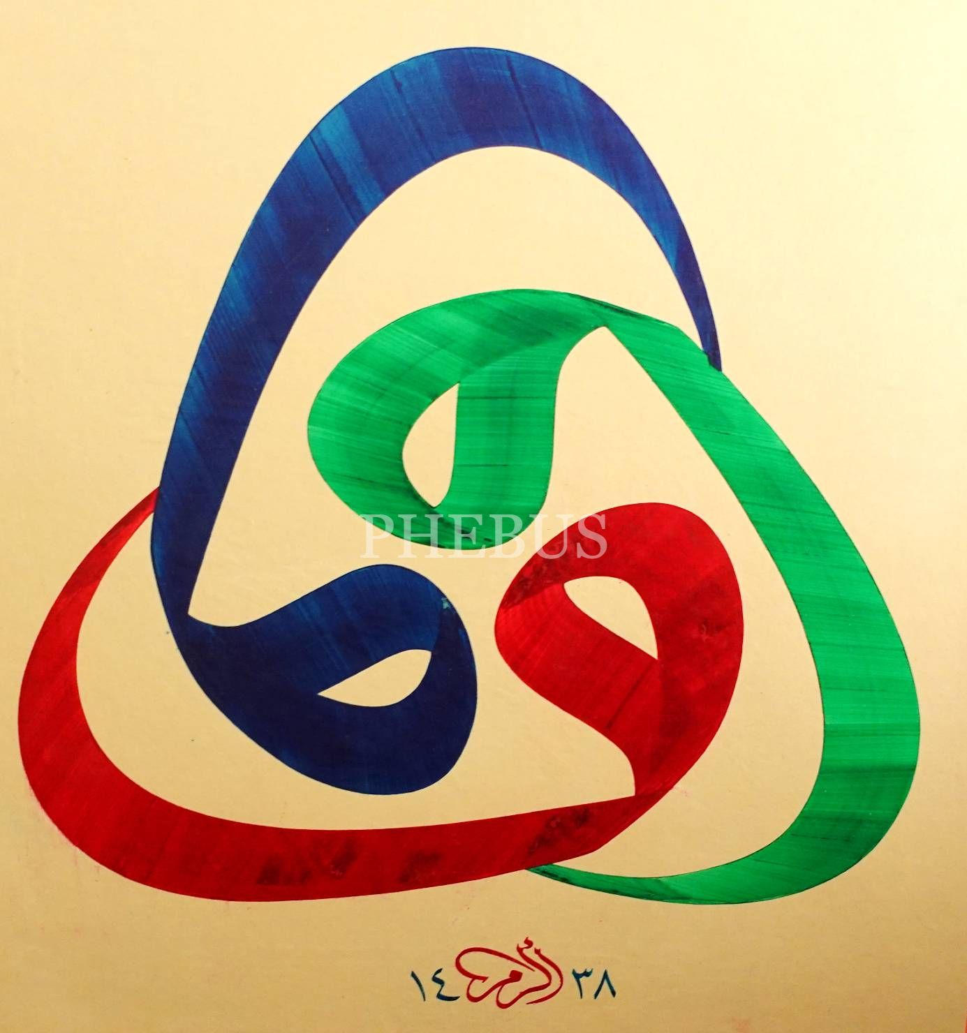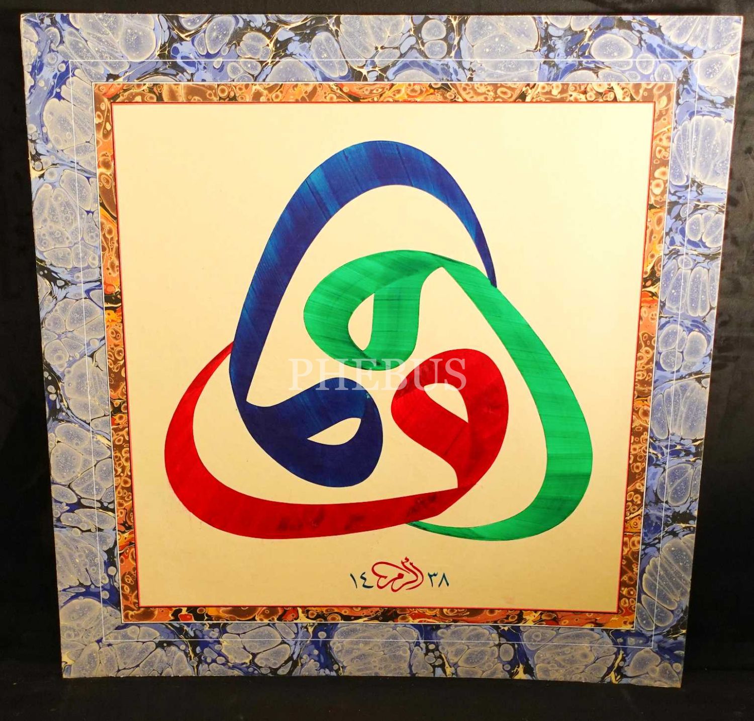 Ekrem ketebeli, 1438 tarihli celî sülüs üç vav tasarımı, ebru cetvelli ve pervazlı, 68x70 cm