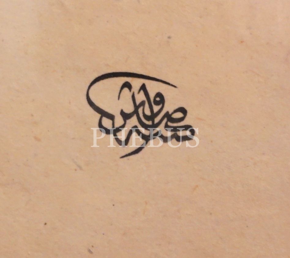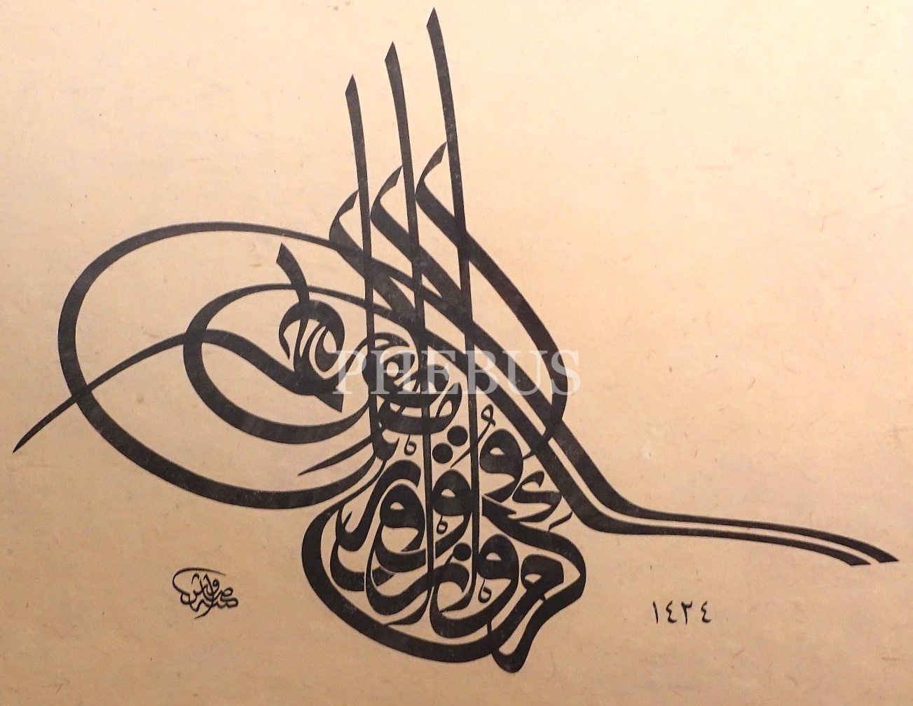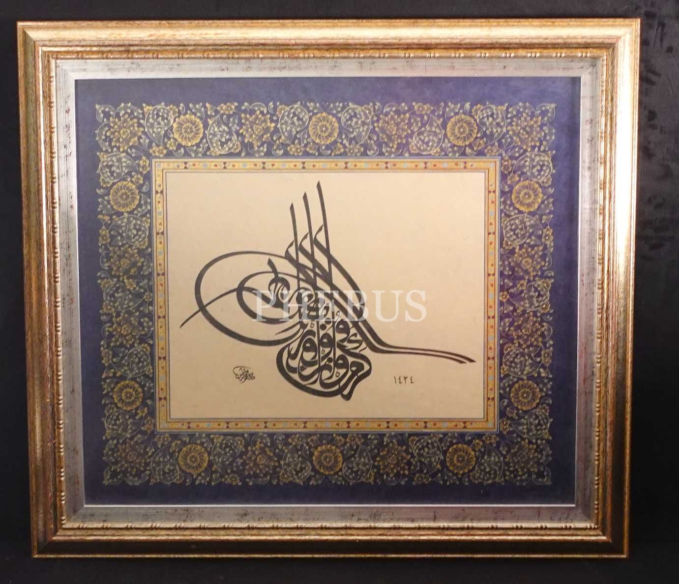 Savaş (Çevik) ketebeli ve 1424 tarihli tuğra formunda yazı , tezhipli, yazı: 28x37 cm, çerçeve: 61x70 cm