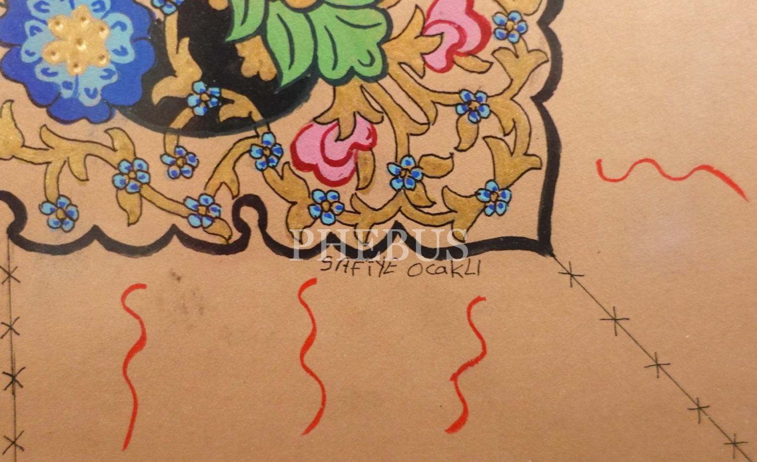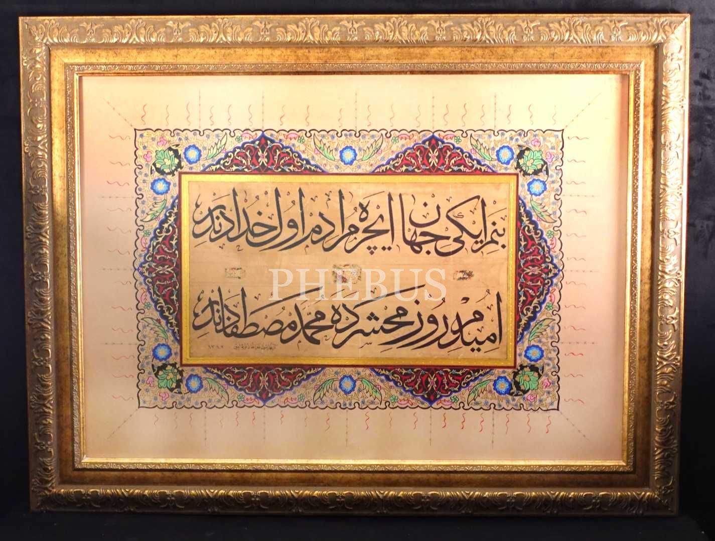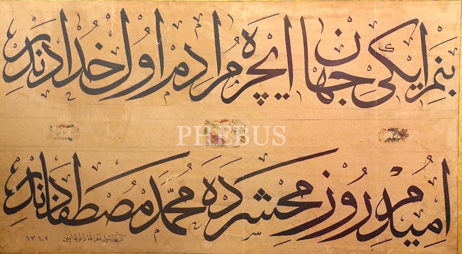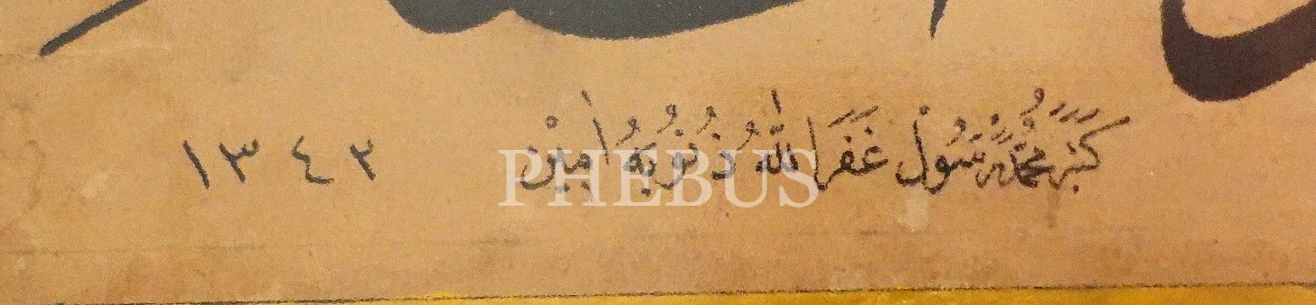 Muhammed Rasul ketebeli, 1342 tarihli celî sülüs yazı ile "Benim iki cihan içre murâdım ol Hüdâ´dandır, Ümidim rûz-i mahşerde Muhammed Mustafa´dandır", tezhip: Safiye Ocaklı, yazı:41X60 cm, çerçeve: 71X95 cm