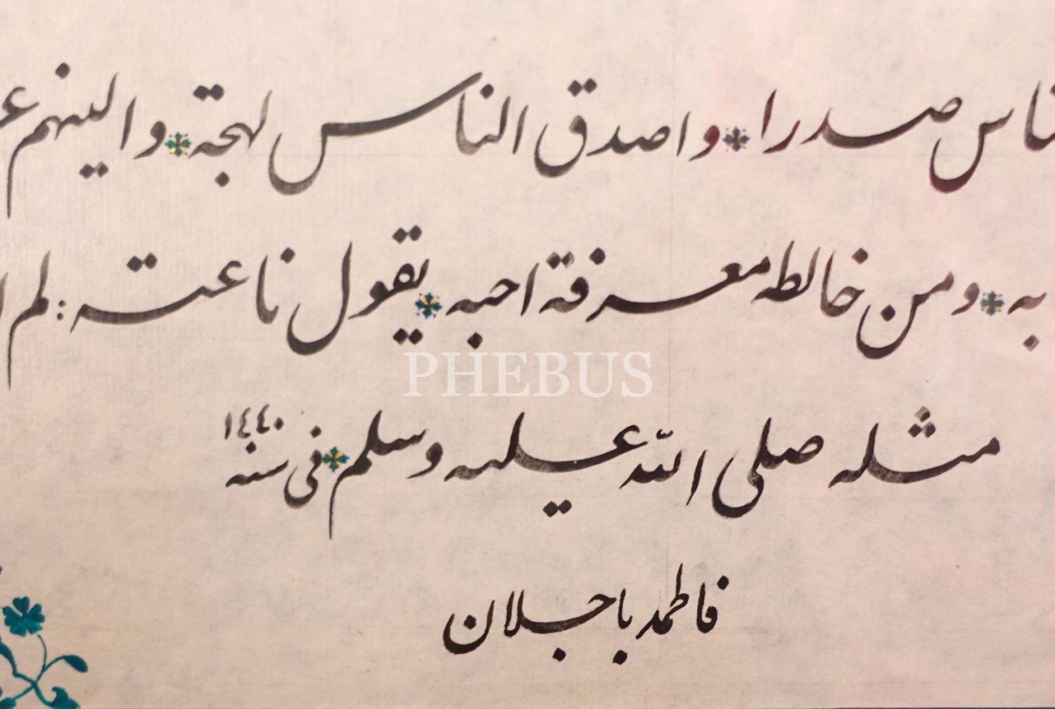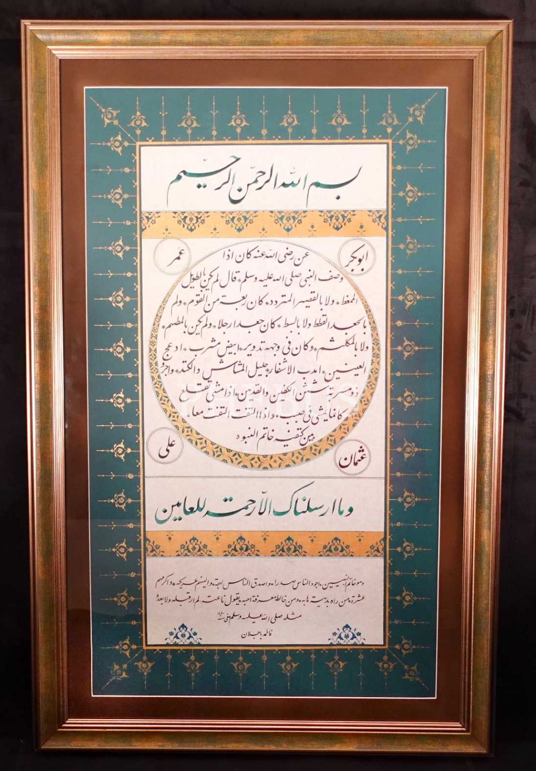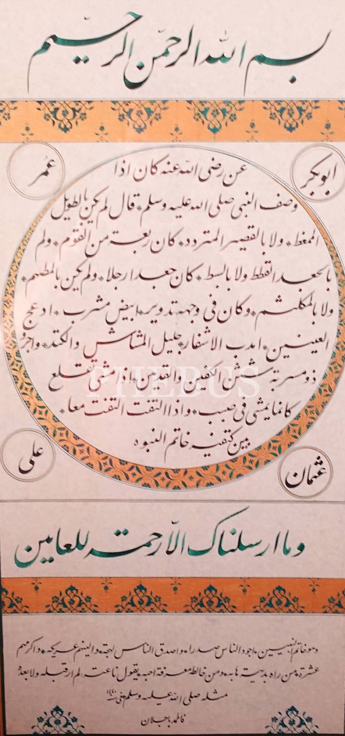Fatma Bacelan ketebeli, 1440 tarihli celî ta´lik hilye-i şerif, tezhipli, yazı: 33x63 cm, çerçeve: 62x92 cm