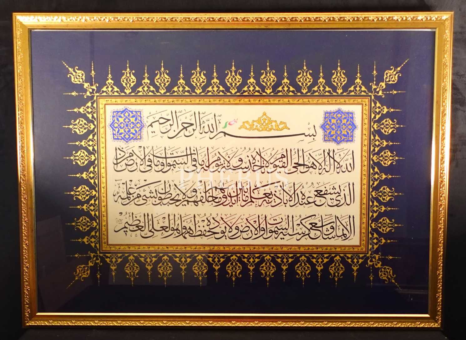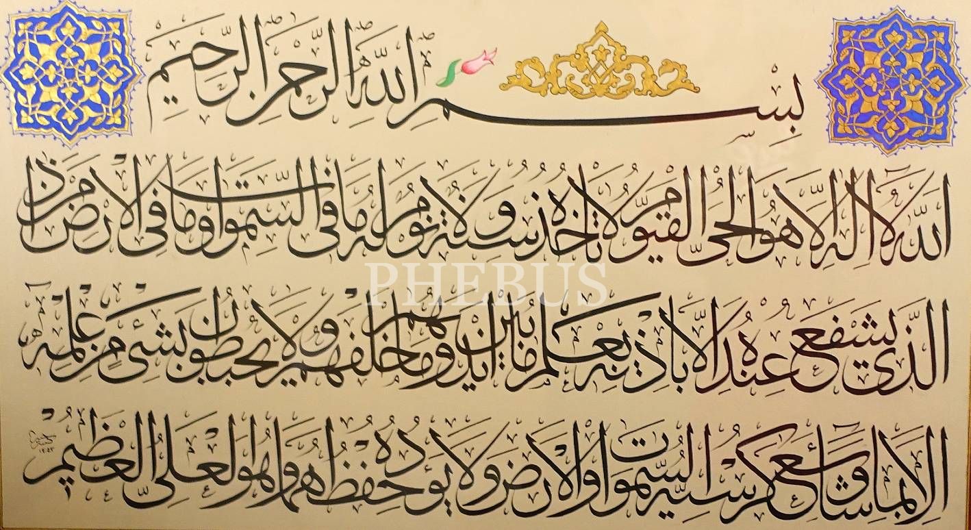 Hayri (Şâmî) ketebeli, 1443 tarihli sülüs Ayete´l-Kürsî, tezhipli, yazı: 50x63 cm, çerçeve: 76x100 cm