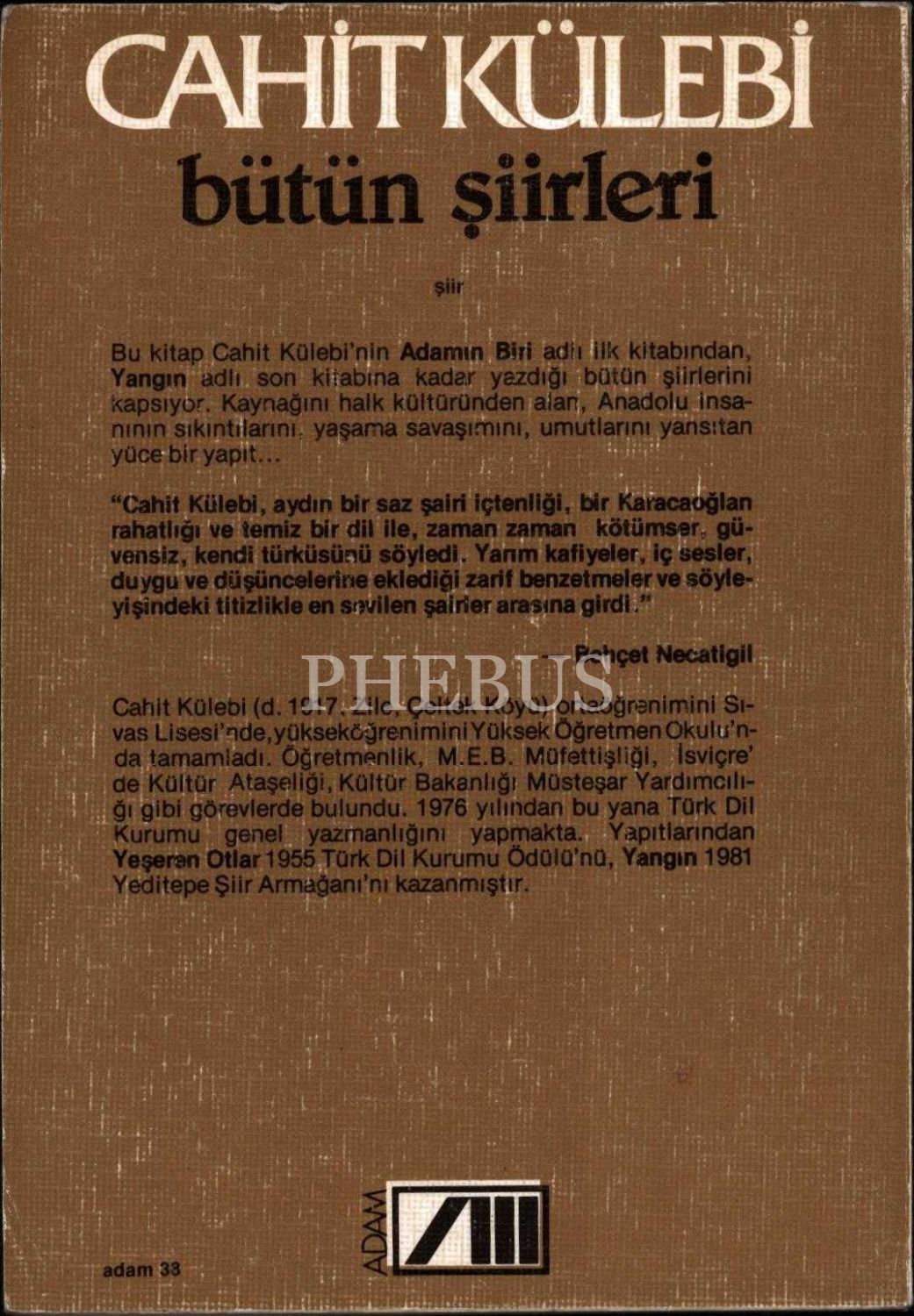1940 sonrası Türk şiirinde, gelenekle bağını koparmadan yenileşmeyi başarabilen az sayıdaki şairlerden biri olan Cahit Külebi´nin (1917 - 1997) "Adamın Biri, Rüzgâr, Yeşeren Otlar, Atatürk Kurtuluş Savaşında, Süt, Türk Mavisi ve Yangın" adlı yedi şiir kitabını bir araya getiren toplu şiirlerinin ilk basımı...