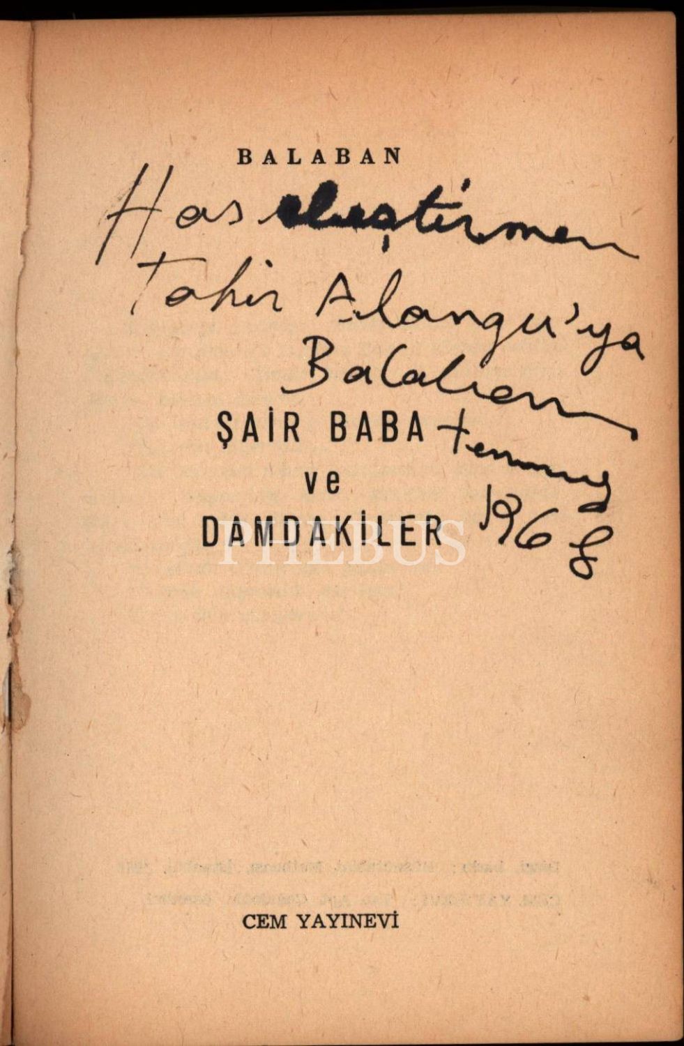 ŞAİR BABA VE DAMDAKİLER, Balaban, 1968, Cem Yayınevi, 406 sayfa, 13 X 19,5 cm… Tahir Alangu´ya imzalı…