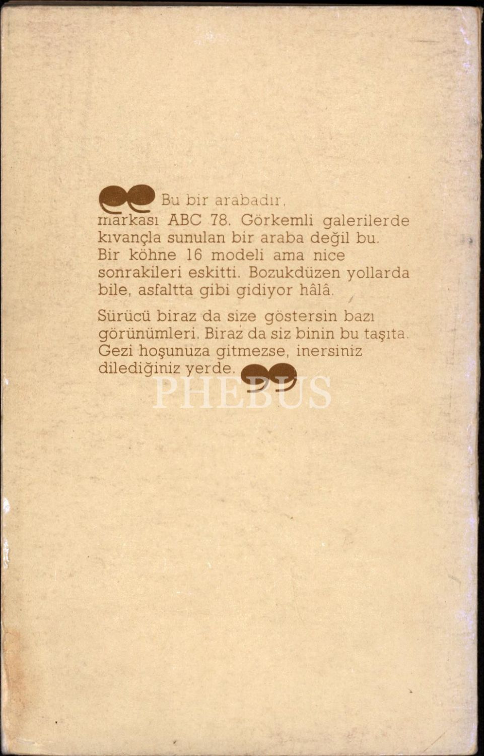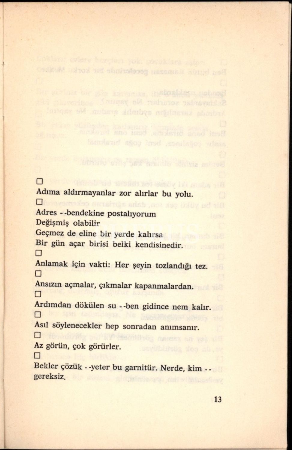 Modern Türk şiirinin hiçbir akımına katılmayan ama her akımdan biraz etkilenen ve daha çok da her akımı önemli ölçüde etkileyen; en çalışkan, en üretken şairi, oyun yazarı, çevirmeni ve edebiyat öğretmeni Behçet Necatigil´in (1916 - 1979); "şiircikler, şiir uçları" adını verdiği "bir dizede bırakılmış şiirsiler" ve "şiir ve çevresi konularda tanımlar, gözlemler, aforizmalar, özdeyişler"in yanı sıra, "tecrübeler, öğütler, uyarmalar" içeren deneme ve söyleşilerinin yer aldığı eseri... 1100 adet basılan kitabın 63 numaralı nüshası...