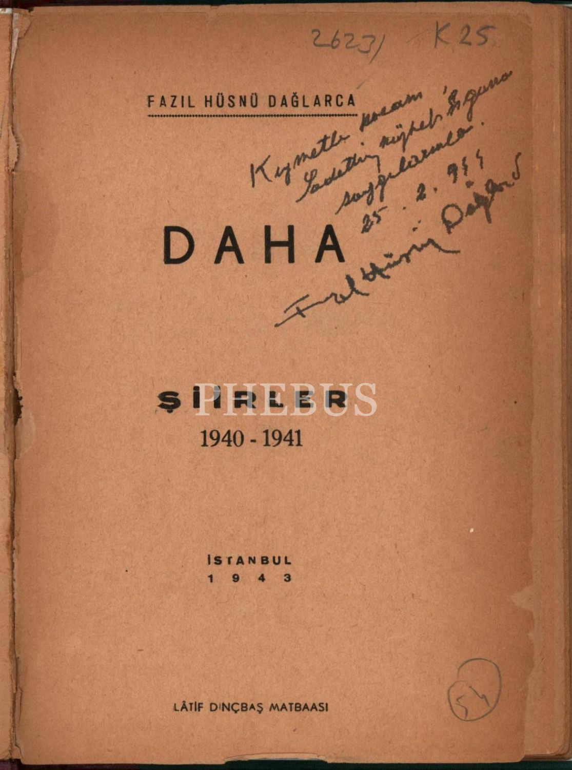 DAHA, Fazıl Hüsnü Dağlarca, 1943, Latif Dinçbaş Matbaası, 160 sayfa, 14 X 20 cm… Saadettin Nüzhet Ergun´a imzalı…