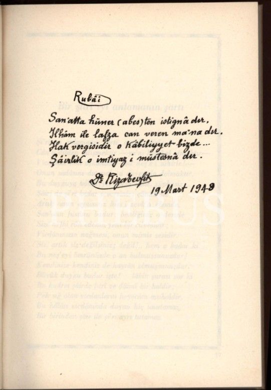 Aslında Mekteb-i Tıbbiye mezunu olmasına ve felsefe eğitimi almamış olmasına karşın, felsefeye ilgisi nedeniyle “Feylesof Rıza” olarak tanınan Rıza Tevfik (1869 – 1949); felsefeci, siyasetçi ve şair kimliğiyle son dönem Osmanlı aydınlarının en ilginç simalarından biridir. Sevr Antlaşması’nı imzalayan Osmanlı delegasyonunda bulunduğu için, diğer “Yüzellilikler” gibi uzun yıllar sürgünde yaşamıştır. "Serab-ı Ömrüm" Feylesof’un bütün şiirlerini bir araya getirdiği kitabıdır.