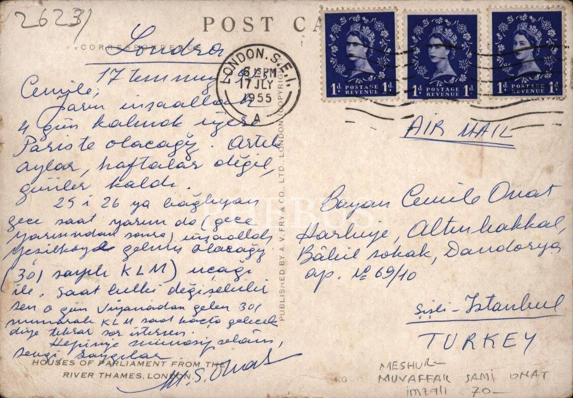 Vazo, Gel Gör ki, Hibiskus Çiçekleri adlı şiir kitapların yanı sıra, özellikle dünya milletlerinin Tanrı anlayışlarını işlediği "Yaratılış" adlı şiir kitabıyla tanınan Muvaffak Sami Onat´ın (1919 - 1986), Londra´dan, eşi Cemile Hanım´a gönderdiği, 1955 tarihli kart...