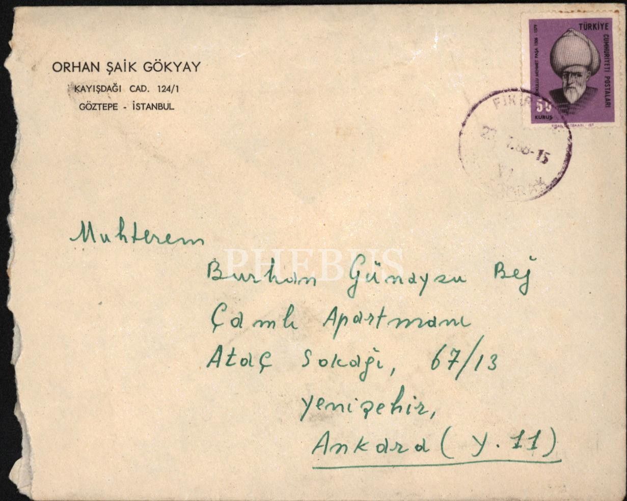 Daha çok “Bu Vatan Kimin” şiiri ile hatırlanmasına karşın, şairliğinden çok, eleştirmenliği ve araştırmacılığıyla Türk edebiyatına çok büyük katkılar sağlamış olan Orhan Şaik Gökyay´ın (1902 - 1994), yazar ve çevirmen Burhan Günaysu´ya yazılmış mektup… Orhan Şaik Gökyay antetli zarf içinde...