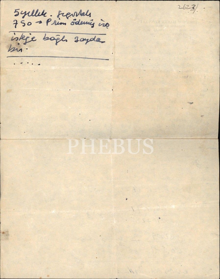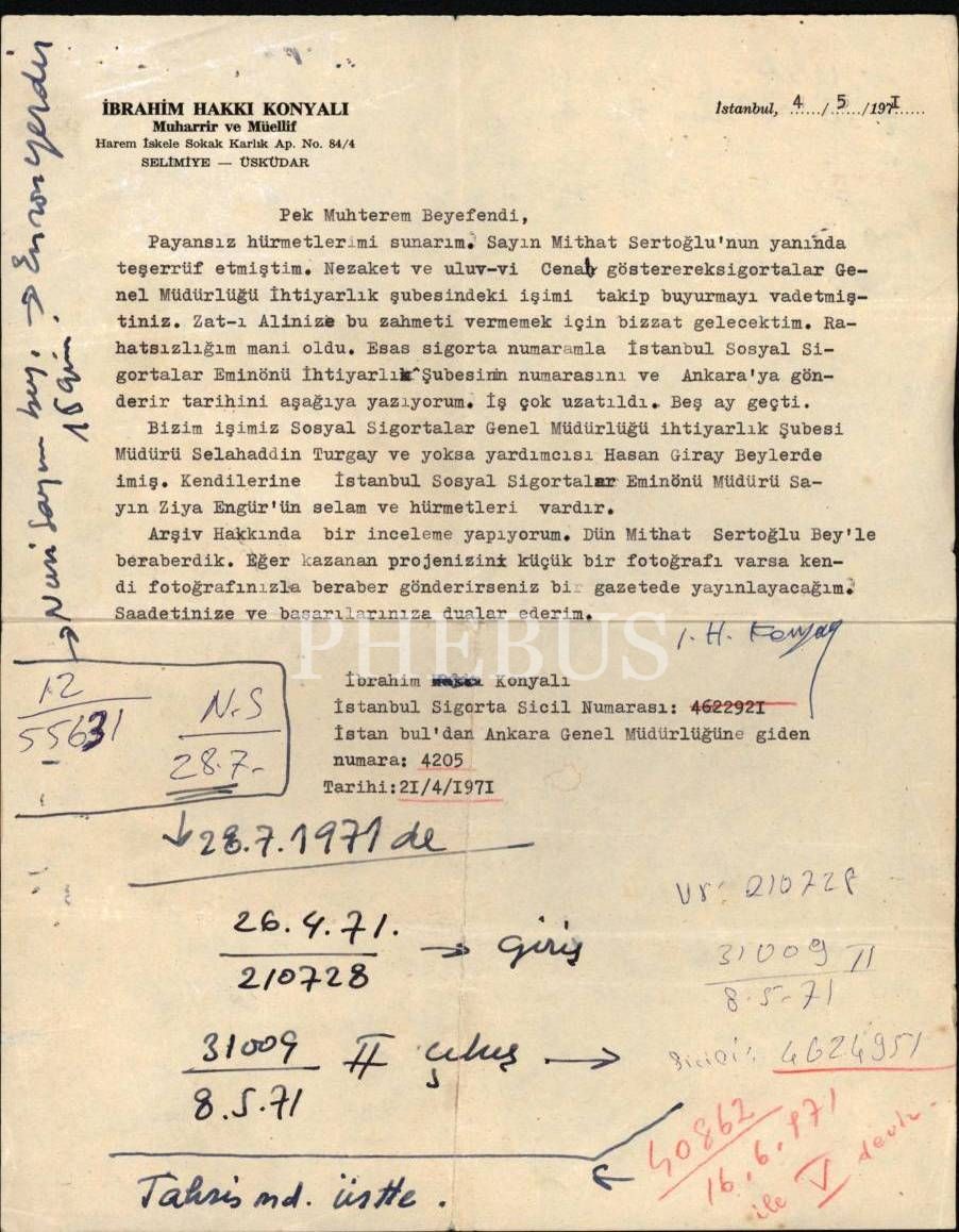 Tarihçi ve kitabe uzmanı İbrahim Hakkı Konyalı´nın (1896 - 1984), sigorta işiyle ilgili bir takip ricasıyla yazdığı mektup… Daktiloyla yazılmış mektupta ayrıca el yazısıyla yazılmış sigorta numarası, prim günü vs. gibi bilgiler de var.