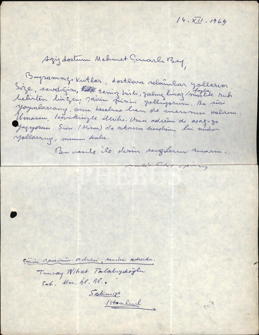 Beş Hececilerden, şair ve yazar Halit Fahri Ozansoy’un (1891 – 1971), Hisar dergisi kurucularından Mehmet Çınarlı´ya (1925 - 1999) yazdığı, 14.12.1969 tarihli mektubu…
