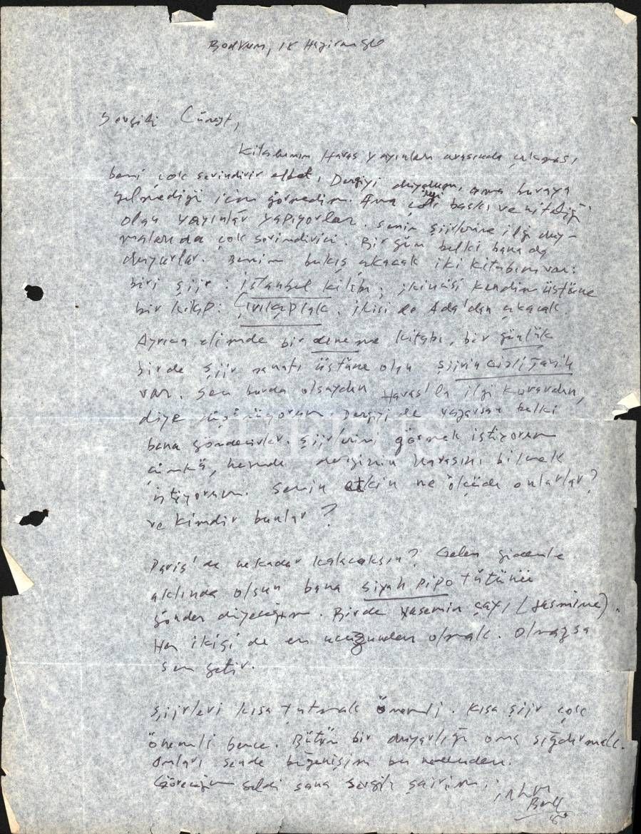 Türk şiirinin en deneyci şairlerinden İlhan Berk´in (1918 - 2008); şair, yazar, gazeteci, fotoğraf sanatçısı ve küratör Cüneyt Ayral´a (D. 1954) yazdığı ilginç bir mektup… Şair, bu kış "İstanbul Kitabı" ve kendisi üstüne yazdığı "Çırılçıplak" adıyla bir kitabın Ada Yayınları´ndan çıkacağını yazıyor ve Paris´ten siyah tütün ve Jasmine çayı ısmarlıyor; en ucuzundan...