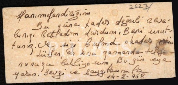 Ölümünden sonra hakkında Cemal Süreya´nın çok güzel bir şiir yazdığı Mübeccel İzmirli (1934 - 1982); elinde kaleminden başka bir şeyi olmayan ama erkek egemen edebiyat dünyasında var olmayı beceremeyen, hüzünlü, kırık ve kırgın bir şair ve yazardır. Müzayedeye sunulan ürün, Mübeccel İzmirli´nin Gazeteciler Cemiyeti´nde redaktörlük yaptığı tarihlerde, bir türlü ulaşamadığı bir "hanımefendi"ye yazılmış notunu içeriyor.
