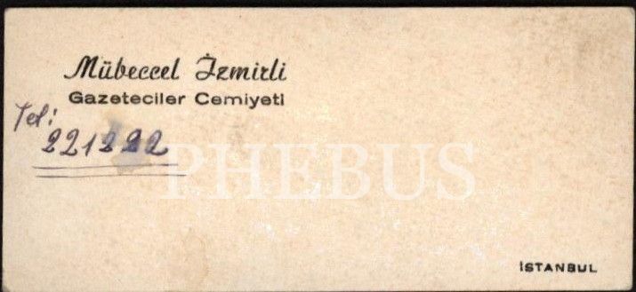 ŞAİR MÜBECCEL İZMİRLİ´NİN, ARKASINA KENDİ EL YAZISI İLE YAZDIĞI, GAZETECELİLER CEMİYETİ ANTETLİ KARTVİZİTİ, 9 X 4 cm…