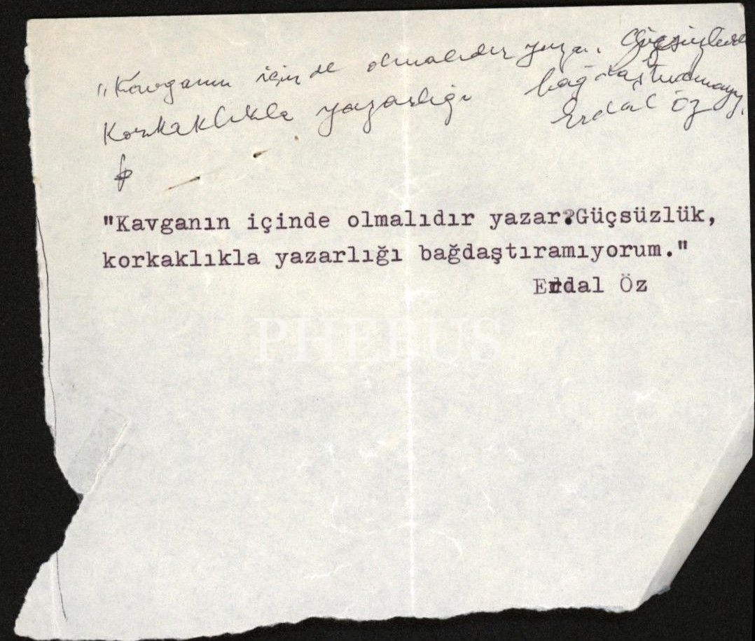 YAYINCI VE YAZAR ERDAL ÖZ´ÜN, YAZARLIK HAKKINDAKİ GÖRÜŞÜNÜ İFADE EDEN, EL YAZISI VE DAKTİLO YAZISIYLA YAZILMIŞ İMZALI NOT, 13 X 11,5 cm...