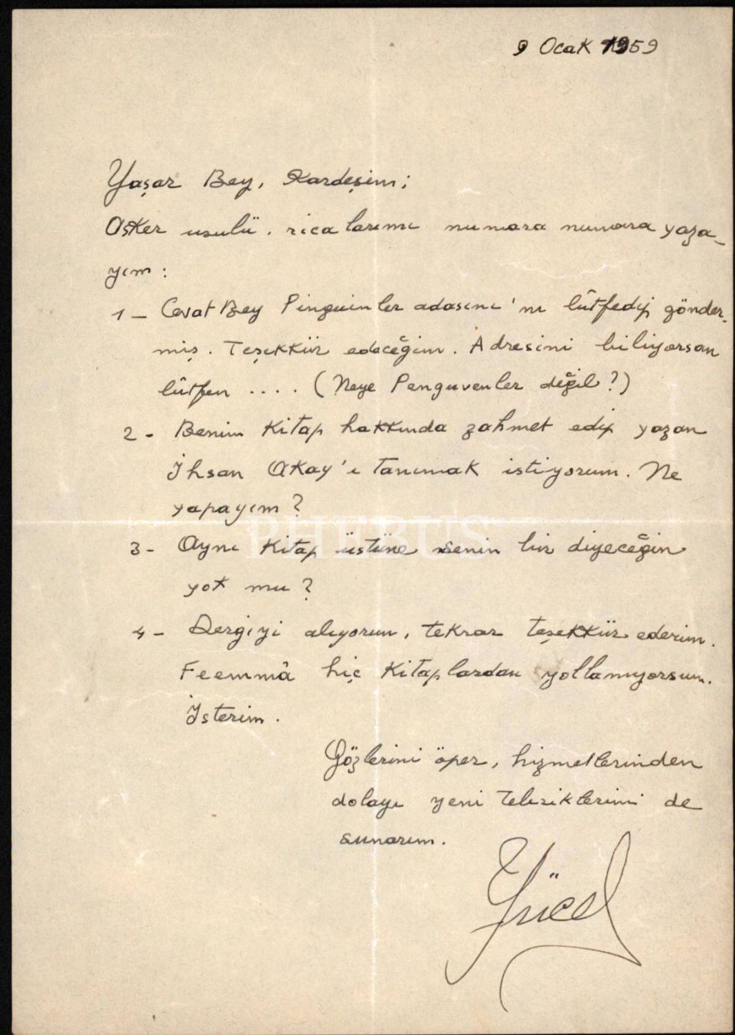 Türkiye´nin en önemli Milli Eğitim Bakanı ve en değerli kültür insanlarından biri olan Hasan Ali Yücel´in (1897 - 1961), Varlık dergisi ve Varlık Yayınları´nın kurucusu Yaşar Nabi Nayır´a gönderdiği ve "asker usulü" ricalarını sıraladığı mektubu…