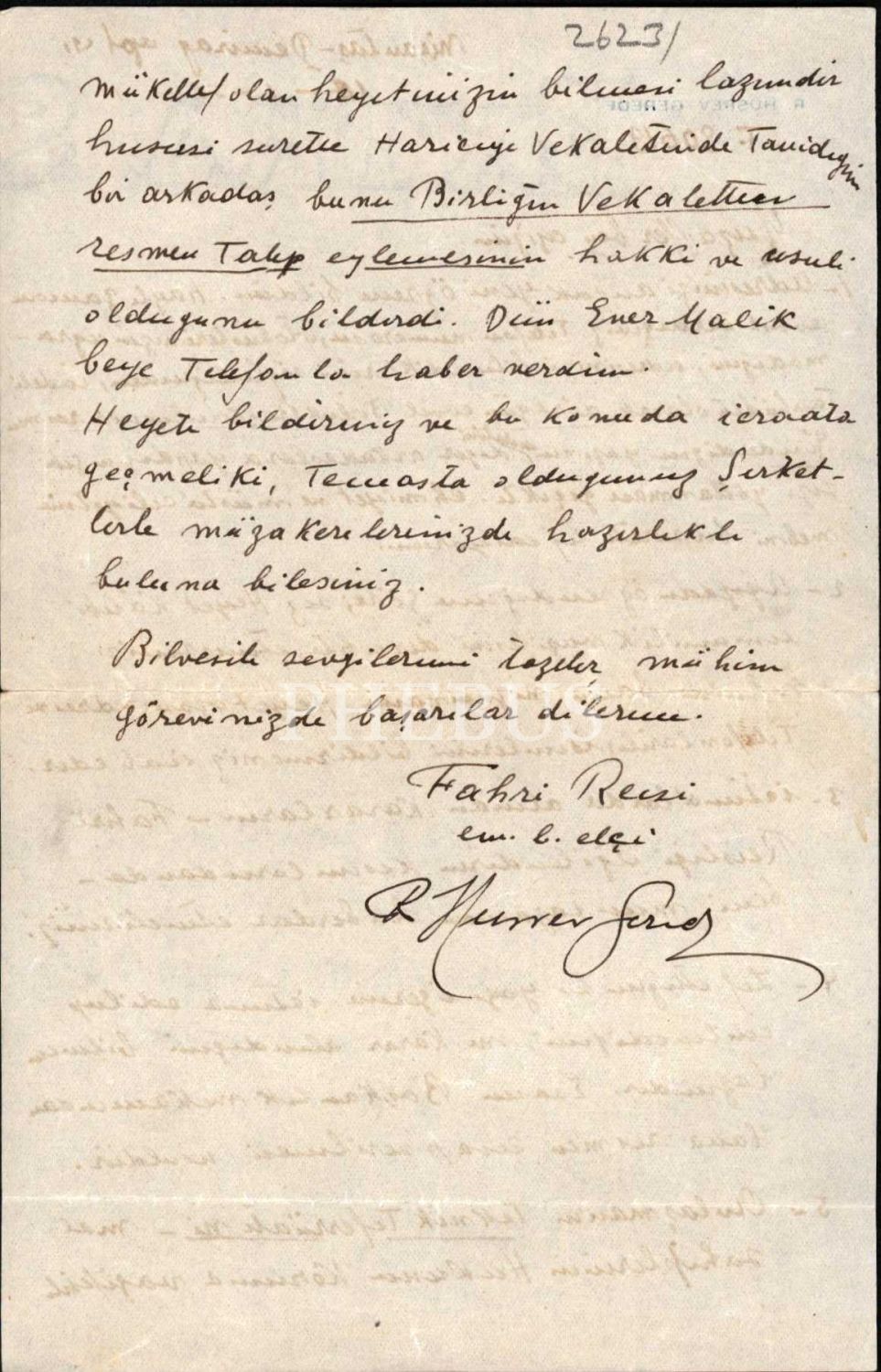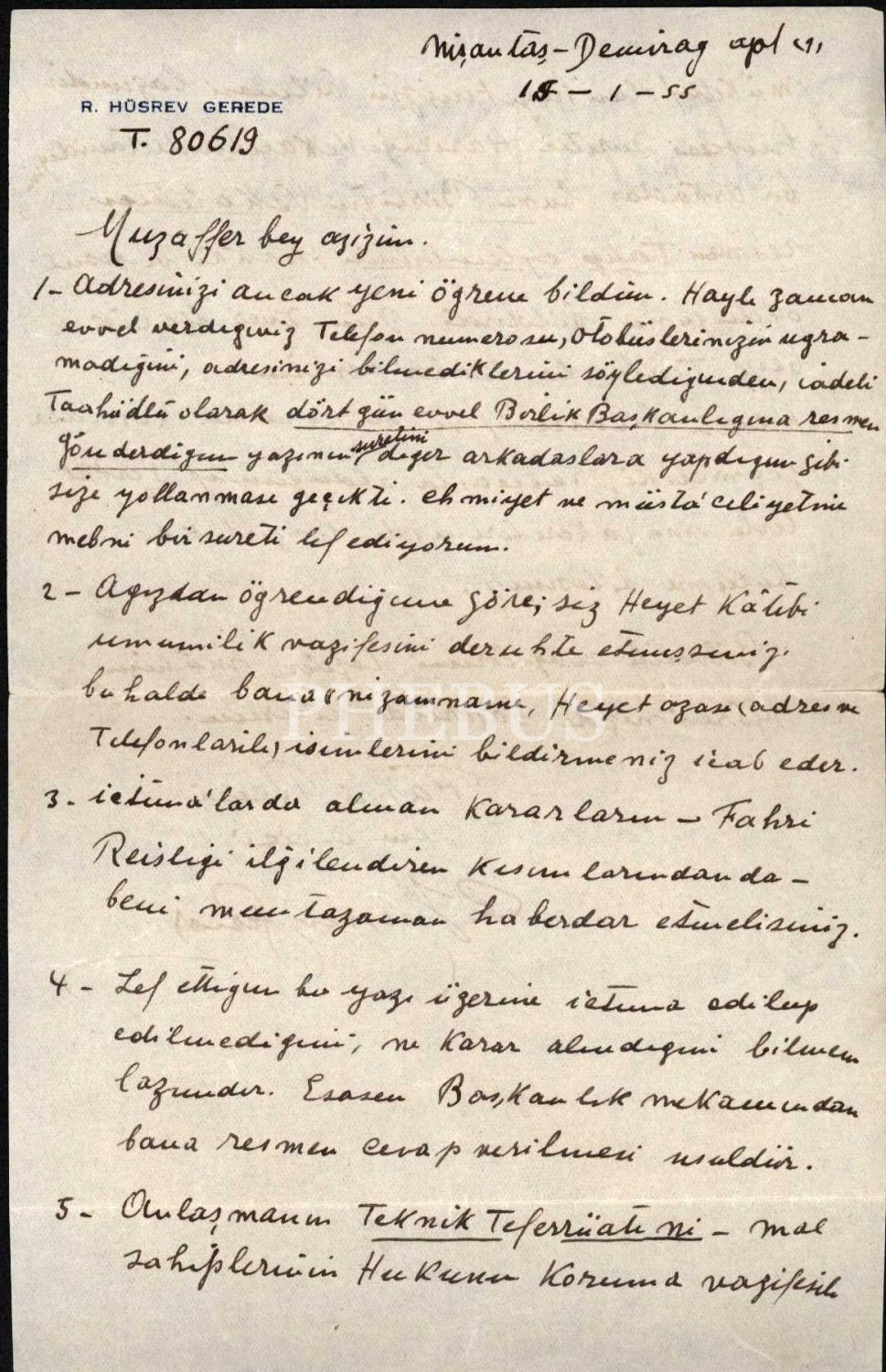 Mustafa Kemal Paşa´nın Samsun´a birlikte çıktığı arkadaşlarından, asker, diplomat ve siyasetçi Hüsrev Gerede´nin (1884 - 1962) "Yugoslavya’da Emlaki Bulunanların Haklarını Koruma Cemiyeti" fahri başkanı olduğu dönemde, cemiyetin kâtib-i umumisi olan Muzaffer Bey´e hitaben yazdığı, 15.01.1955 tarihli mektup... Kendi adıyla antetli kâğıda...