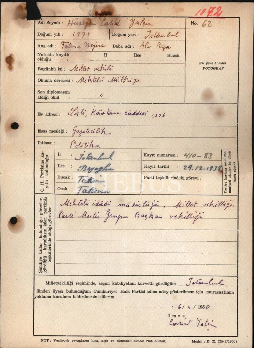Eski Servet-i Fünuncu, İttihatçı, gazeteci ve politikacı Hüseyin Cahit Yalçın´ın 1875 - 1957), el yazısıyla doldurup imzaladığı, milletvekilliği adaylık başvuru formu… Formda "seçim kabiliyetini kuvvetli gördüğü yer" olarak İstanbul´u belirtmişse de, Demokrat Parti İstanbul´u adeta süpürdüğü için, meclise ancak Kars milletvekili olarak girebildi.