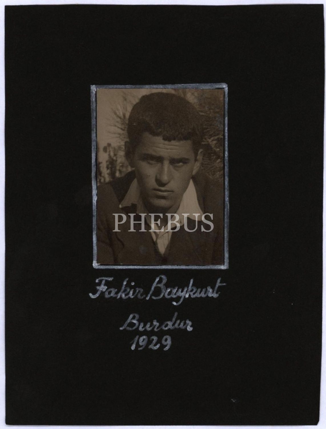 Köy Enstitülü yazarlar içinde, "Yılanların Öcü, Irazcanın Dirliği, Tırpan, Kara Ahmet Destanı" gibi romanlarıyla toplumcu - gerçekçi köy romanının klasiklerine imza atmış olan Fakir Baykurt´un (1929 - 1999) delikanlılık yıllarında çekilmiş bir fotoğrafı... / 14 X 19 cm boyutlarında, siyah kâğıda yapıştırılmış halde...
