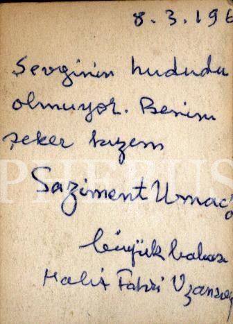 Beş Hececilerden, şair ve yazar Halit Fahri Ozansoy’dan (1891 – 1971), torunu Şazimet Umaç´a "Sevginin hududu olmuyor benim şeker kızım" ithafıyla imzalı...