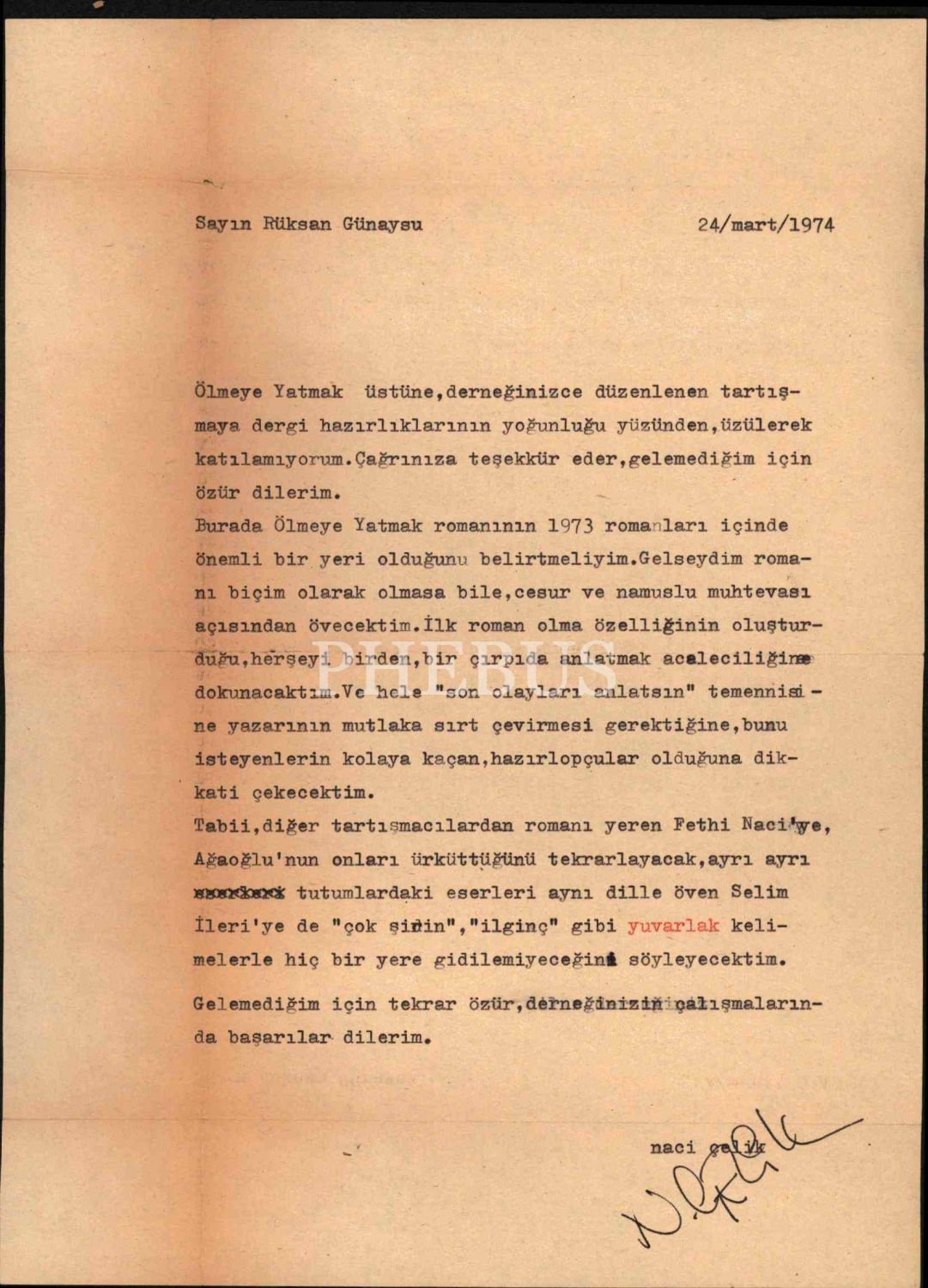 Dönemin edebiyatçılarının yakından tanıdığı, TED Ankara Koleji´nin efsane edebiyat öğretmeni Rüksan Günaysu´nun arşivinden çıkan, aralarında tanınmış şahsiyetlerin yer aldığı 26 adet fotoğraf ve Türkiye Defteri dergisi yöneticilerinden Naci Çelik´in kendisine yazdığı mektup...