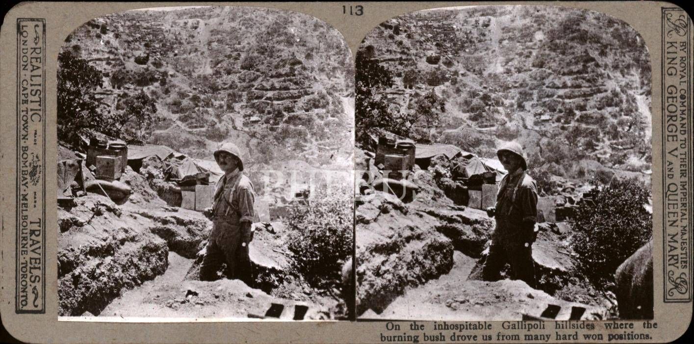 Stereoview kart: Gelibolu yamaçlarında bir Anzak askeri, 9x18 cm