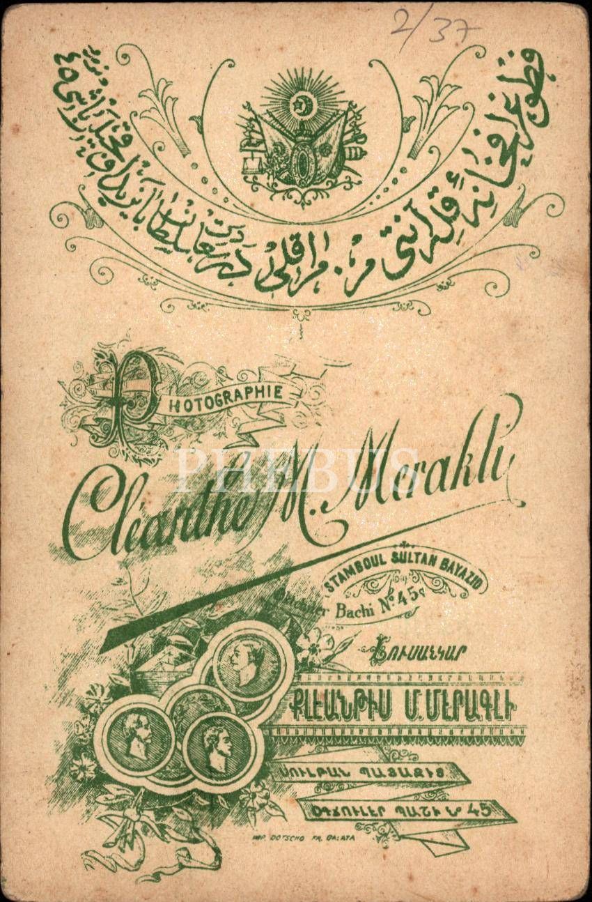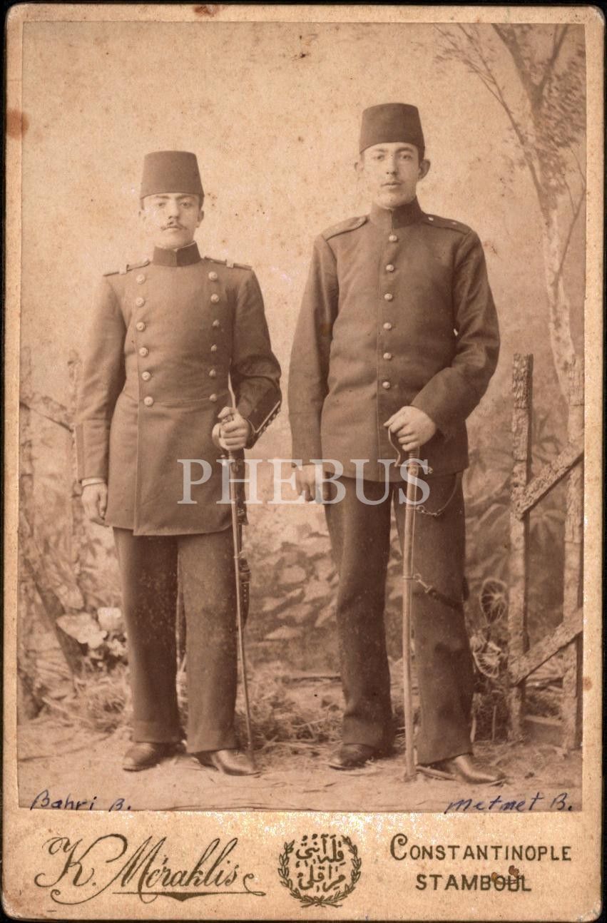 Kılıçlarıyla poz veren genç askerler, Osmanlıca-Fransızca-Ermenice Cleanthe M. Meraklı Fotoğrafhanesi-Stamboul yazılı, 11x16 cm