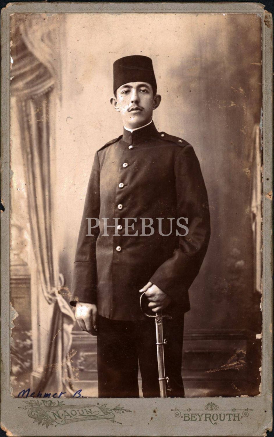Kılıcıyla poz veren fesli Osmanlı askeri, N. Aoun [Nasr Avn] Fotoğrafhanesi-Beyrut, 13x21 cm