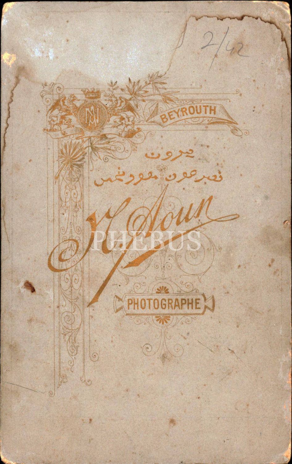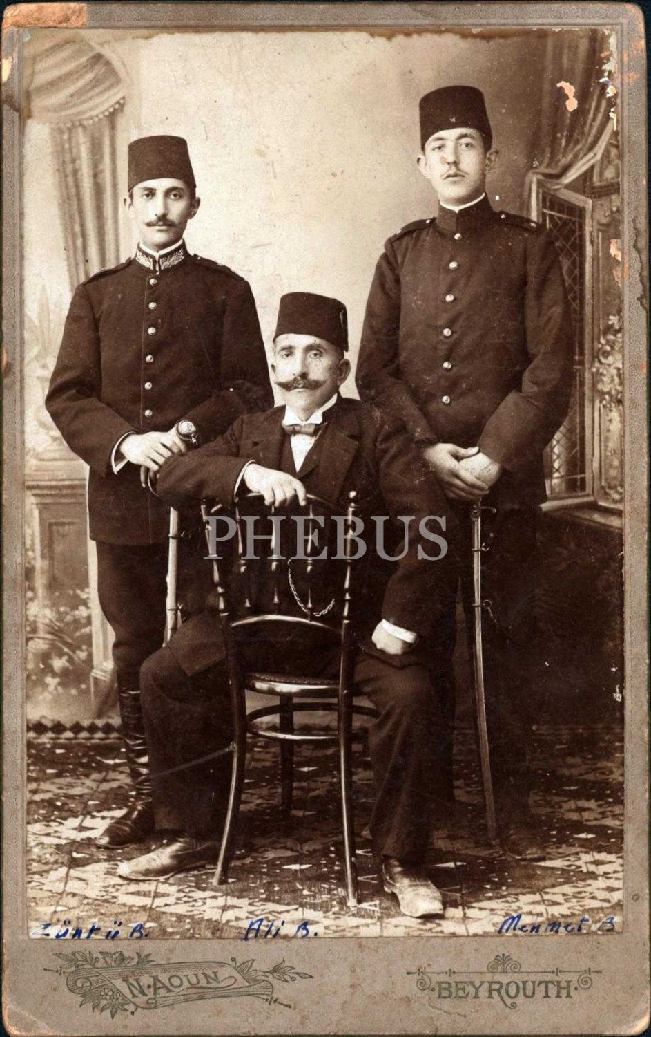 Kılıçlı Osmanlı askerleriyle poz veren beyefendi, N. Aoun [Nasr Avn] Fotoğrafhanesi-Beyrut, 14x21 cm