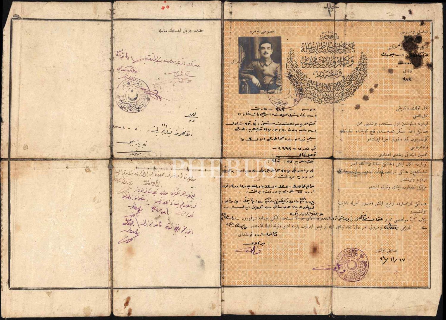 Askerî tarih: topçu kumandanı yaverinin fotoğraflı terhis belgesi, 1334 tarihli, 27x38 cm
