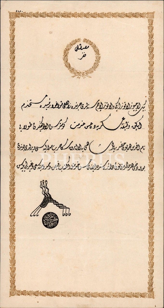 Zırhlı Turgut Reis´de görevli nefere Harbiye Nazırı Enver Paşa´nın pençe mührünü taşıyan harp madalyası beratı, 22x42 cm