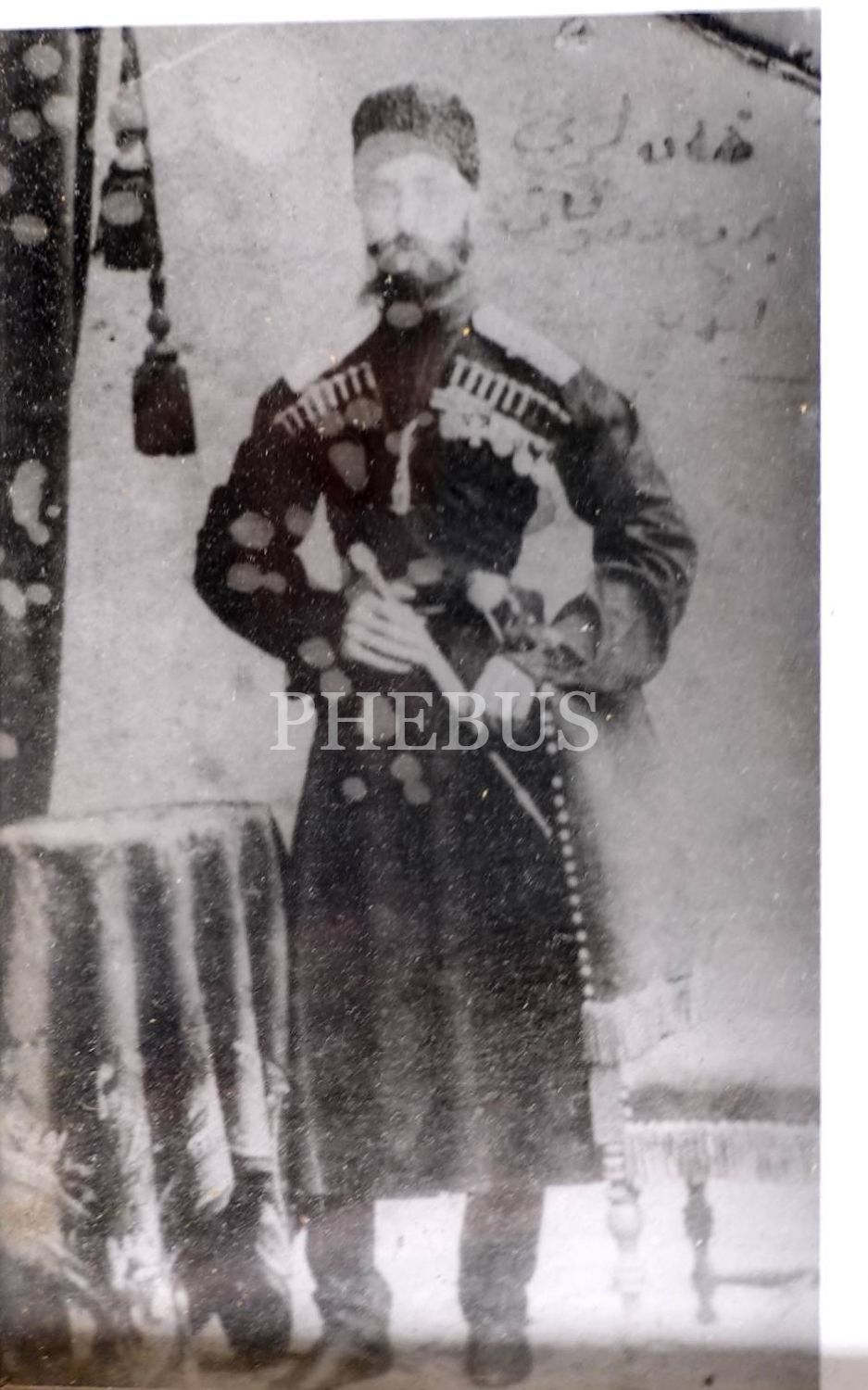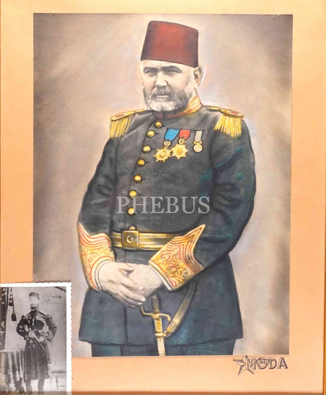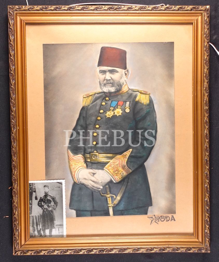 Madalyalı paşa fotoğrafı, alt tarafında yöresel kıyafetli asker fotoğrafı mevcut, Foto Moda, çerçeve: 43x54 cm