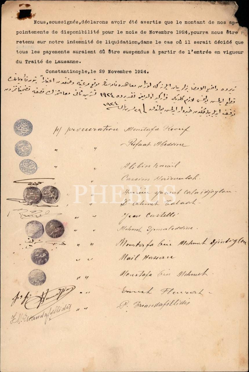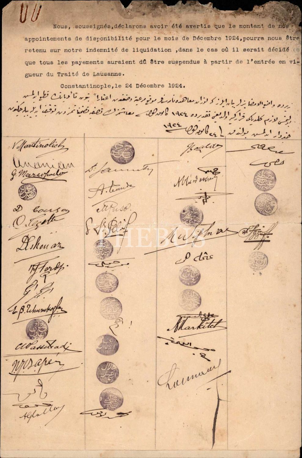 "Aşağıda imzası bulunan bizler beyan eyleriz ki Lozan Muahedenamesinin yürürlüğe girmesinden itibaren bütün ödemelerin kesilmiş bulunması lazım geldiği kararlaştırıldığı takdirde 1924 Teşrin-i Sani ve Kanun-ı Evvel maaşımızın tasfiye tazminatımızdan tevkif edilebileceğinden haberdar edilmiş bulunduk"