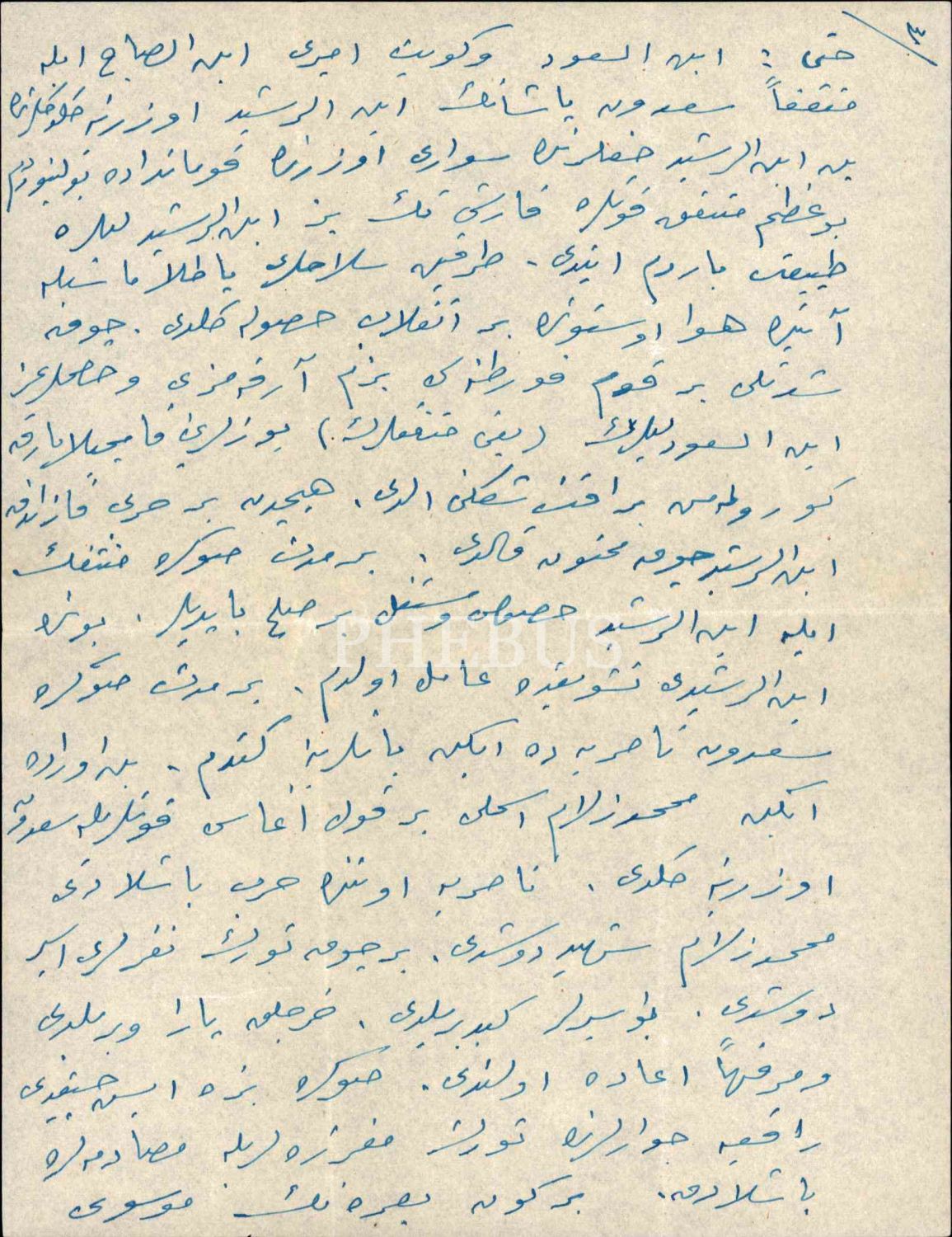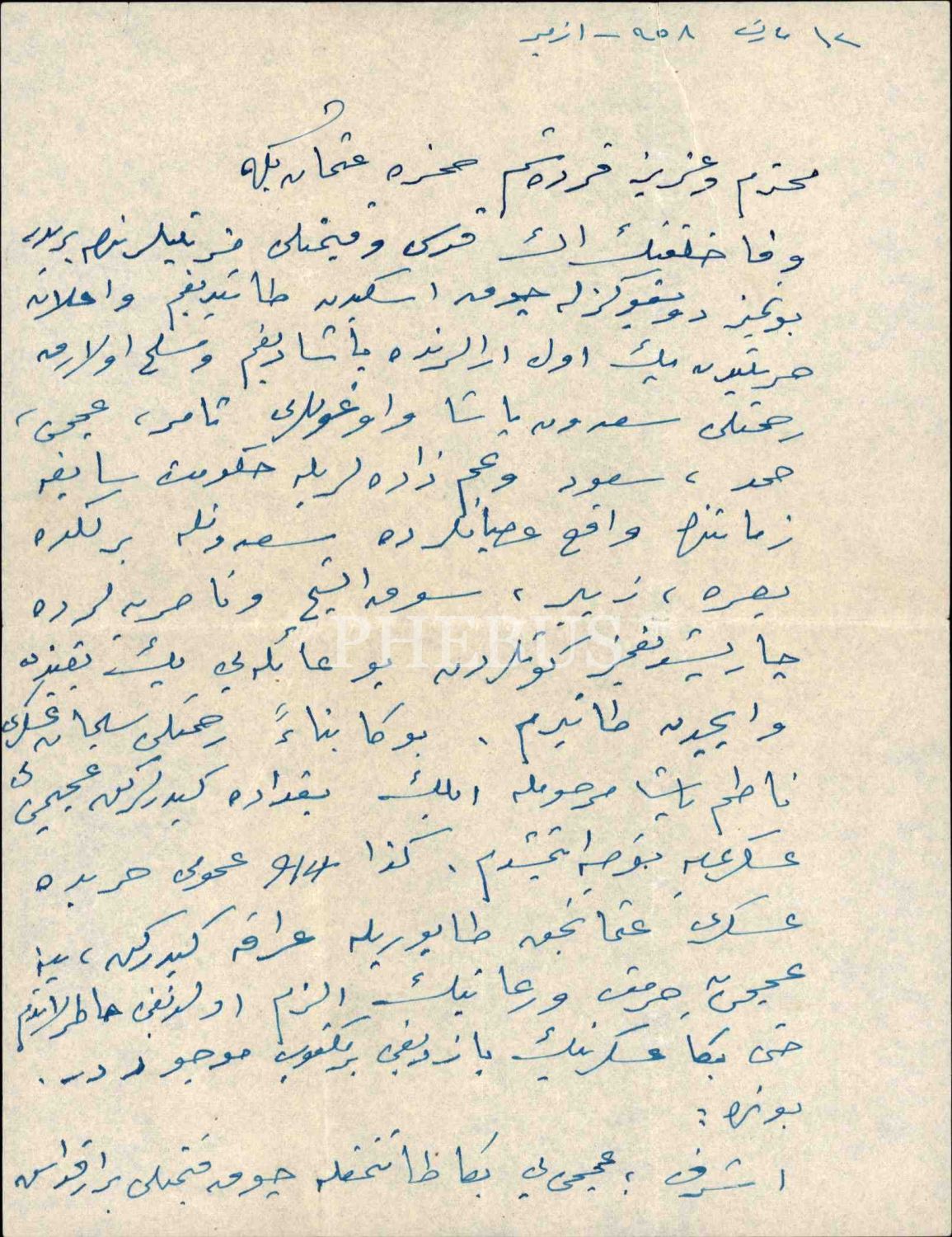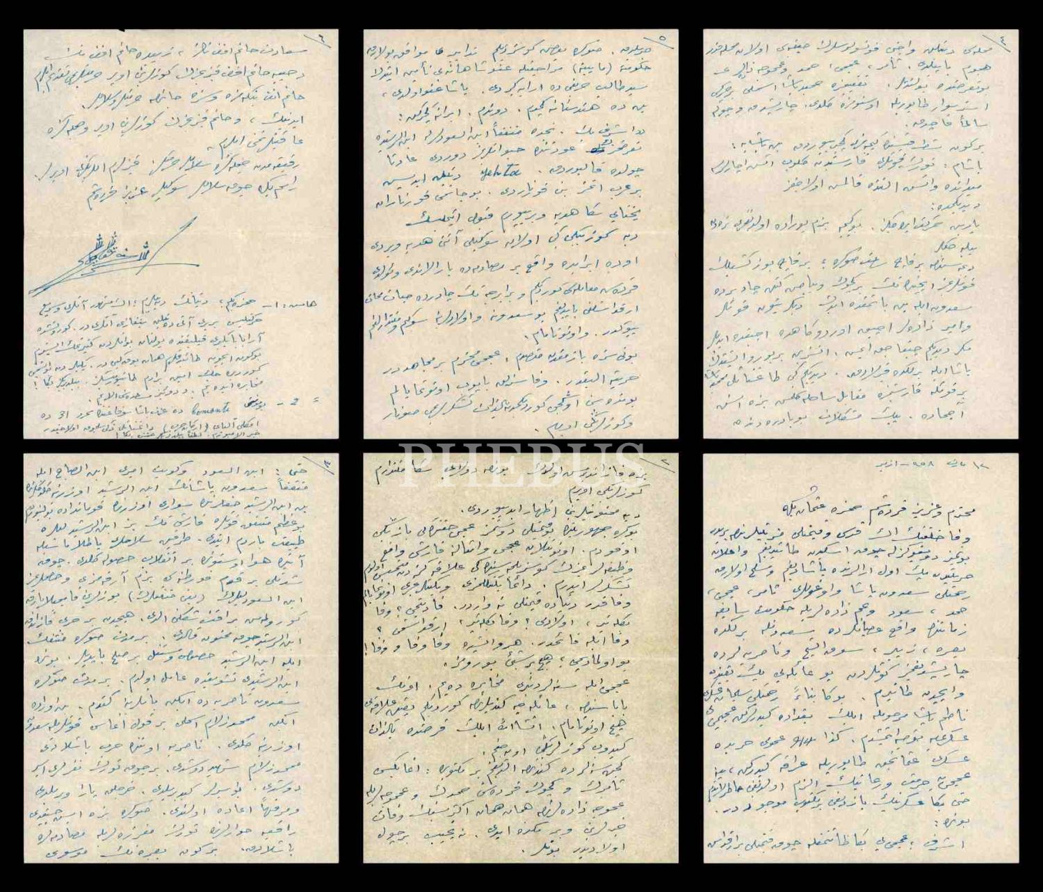 Teşkilât-ı Mahsusa'nın kurucusu Eşref Kuşçubaşı tarafından Irak Şeyhler Şeyhi Acemî [Uceymî] Sadun Paşa hakkında yazılan 6 sayfalık ıslak imzalı mektup, İzmir 1958, 20x27 cm
