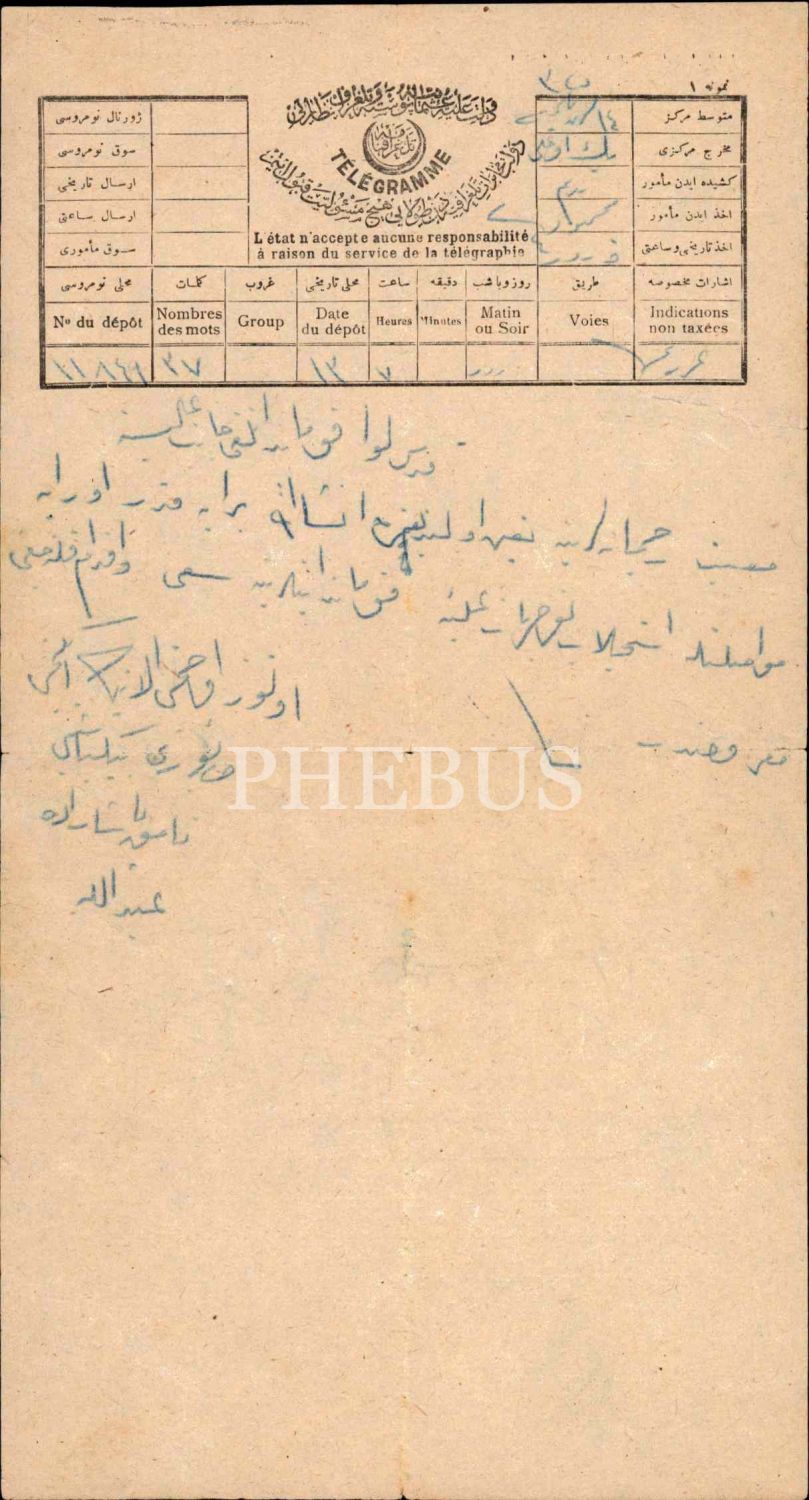 Binbaşı Namık Paşazade Abdullah´ın Kudüs Liva Kumandanlığına hitaben kaleme aldığı tayin konulu ve 1327 tarihli telgraf, 15x28 cm