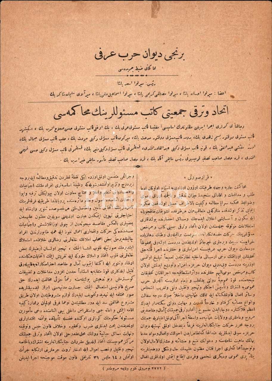 Siyasî tarih: Birinci Divan-ı Harb-i Örfi Muhakemeleri Zabıt Ceridesi´nin İttihad ve Terakki Cemiyeti mesul kâtiplerinin muhakemesini içeren yayını, 23x33 cm