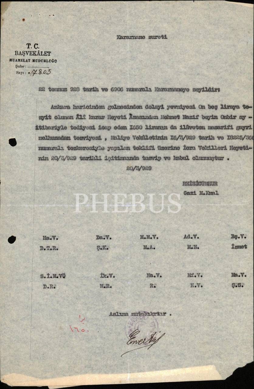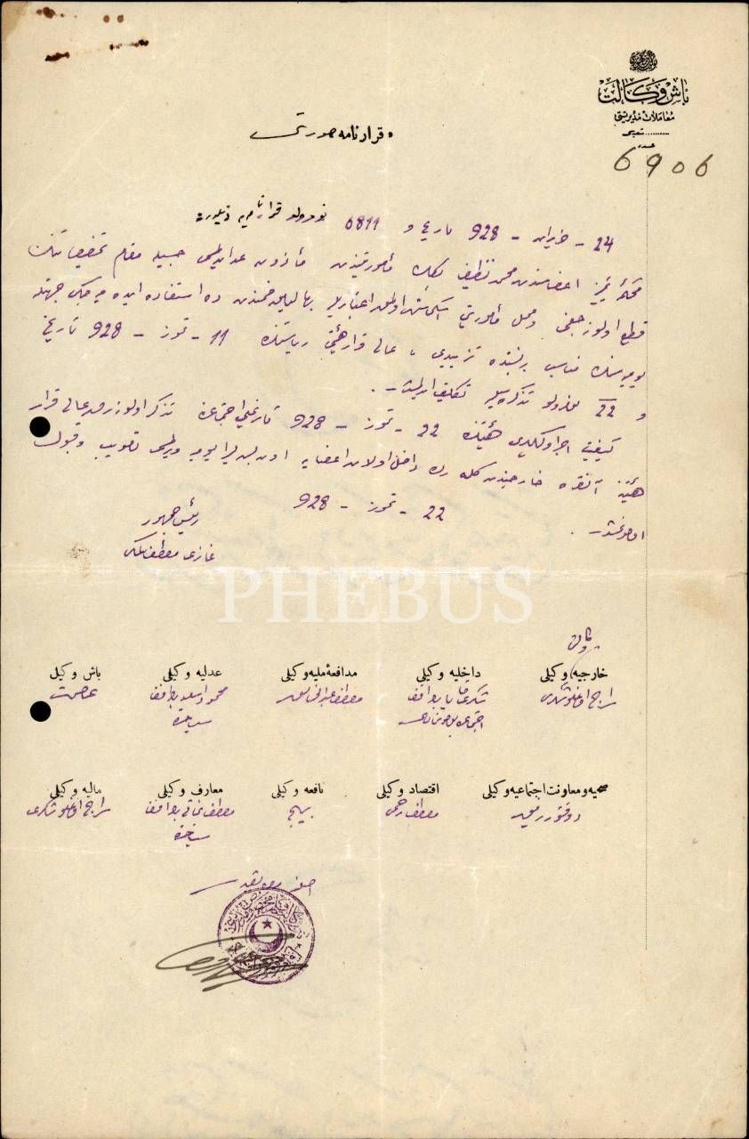 Süleyman Emin Paşa terekesinden, Reisicumhur Mustafa Kemal Atatürk ile Bakanlar Kurulundan onaylı ve 1928-29 tarihli kararname suretleri ve mali evraklar (16 sayfa), 21x31 cm